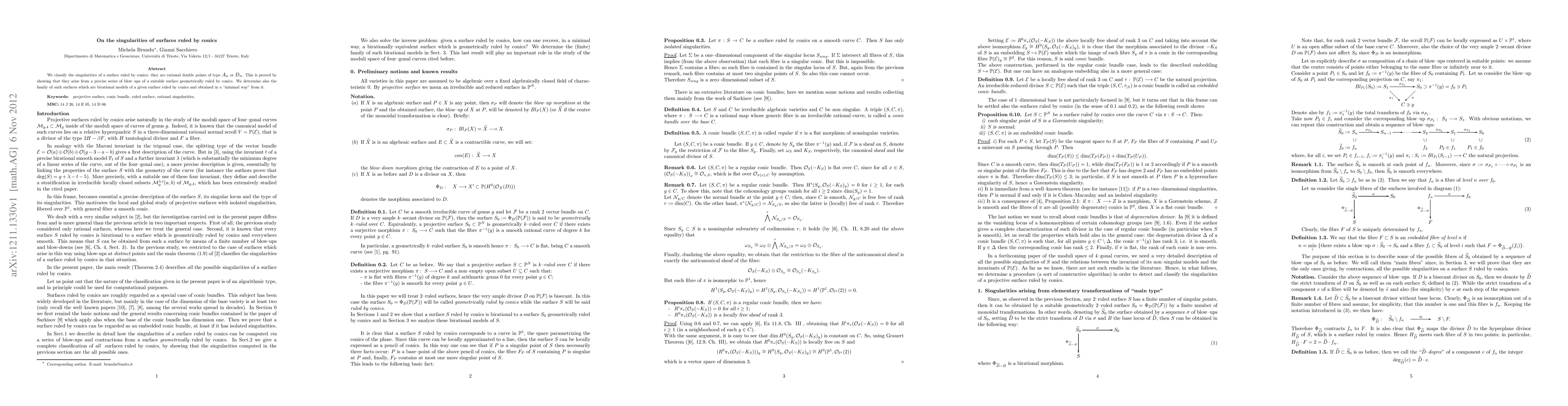 This research classifies singularities of surfaces ruled by conics as rational double points of type $A_n$ or $D_n$, proven through a series of blow-ups. It also identifies the minimal birational models of such surfaces.