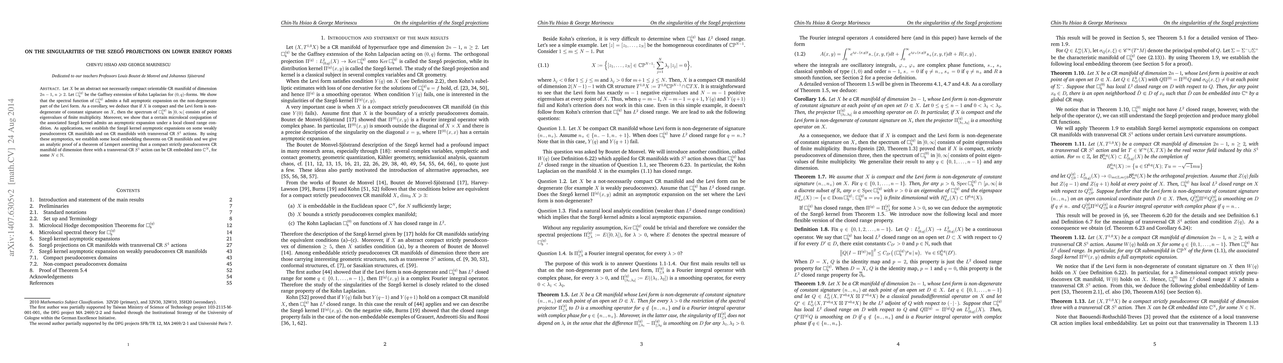 This paper investigates the singularities of Szegő projections on lower energy forms in CR manifolds, proving that the spectral function of the Gaffney extension of Kohn Laplacian has a full asymptotic expansion on the non-degenerate part of the Levi form. It also establishes local embedding theorems and provides an analytic proof for Lempert's theorem on CR embedding of certain pseudoconvex CR manifolds.
