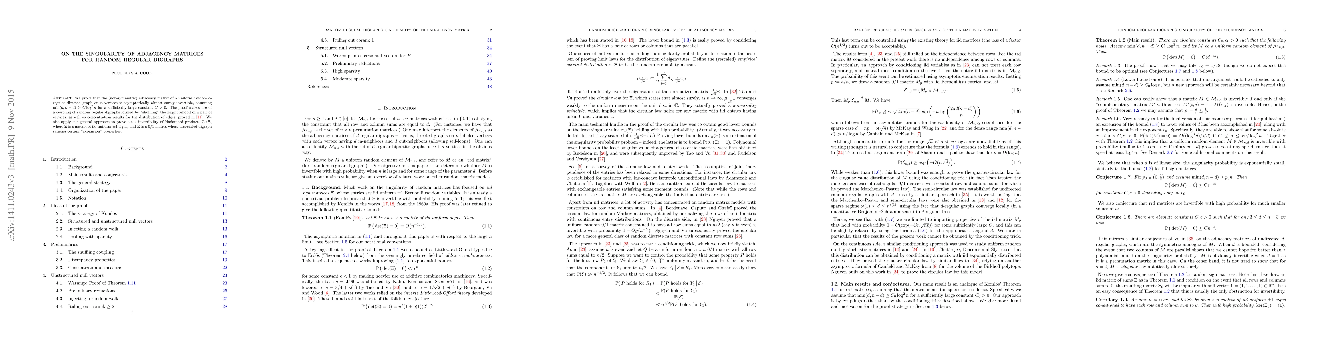 This paper proves that the adjacency matrix of a uniform random $d$-regular directed graph is asymptotically almost surely invertible under certain conditions. The authors use a coupling technique and concentration results to establish this result, extending their approach to show the invertibility of Hadamard products under specific conditions.