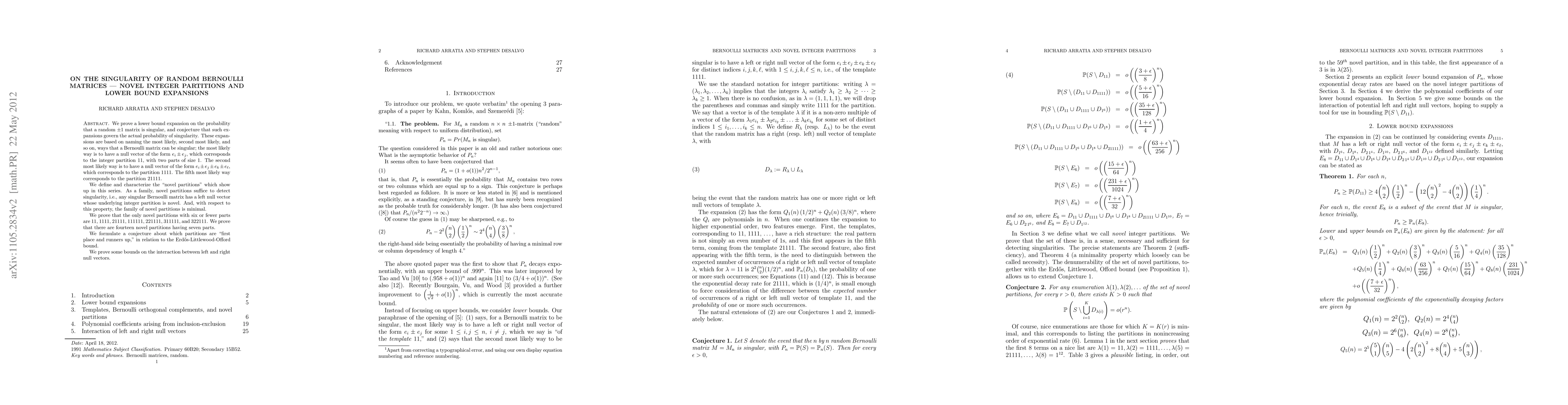 We prove a lower bound expansion on the probability that a random $\pm 1$ matrix is singular, and conjecture that such expansions govern the actual probability of singularity. These expansions are based on naming the most likely, second most likely, and so on, ways that a Bernoulli matrix can be singular; the most likely way is to have a null vector of the form $e_i \pm e_j$, which corresponds to the integer partition 11, with two parts of size 1. The second most likely way is to have a null vector of the form $e_i \pm e_j \pm e_k \pm e_\ell$, which corresponds to the partition 1111. The fifth most likely way corresponds to the partition 21111. We define and characterize the "novel partitions" which show up in this series. As a family, novel partitions suffice to detect singularity, i.e., any singular Bernoulli matrix has a left null vector whose underlying integer partition is novel. And, with respect to this property, the family of novel partitions is minimal. We prove that the only novel partitions with six or fewer parts are 11, 1111, 21111, 111111, 221111, 311111, and 322111. We prove that there are fourteen novel partitions having seven parts. We formulate a conjecture about which partitions are "first place and runners up," in relation to the Erd\H{o}s-Littlewood-Offord bound. We prove some bounds on the interaction between left and right null vectors.