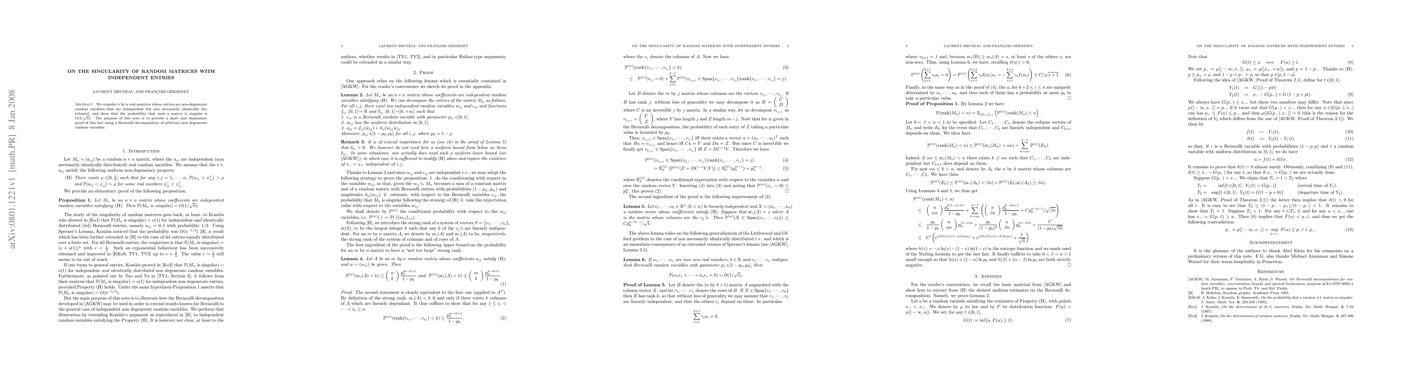 Summary: The paper demonstrates that the probability of a real n by n matrix with independent, non-identically distributed random entries being singular is O(1/sqrt{n}). It provides a concise proof using a Bernoulli decomposition technique.
