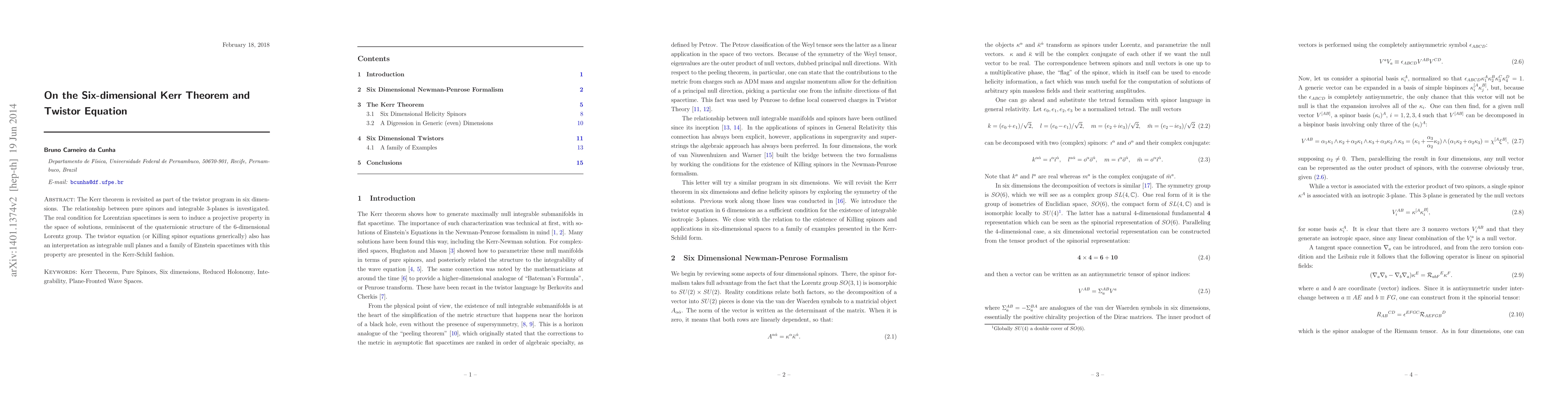 The Kerr theorem is revisited as part of the twistor program in six dimensions. The relationship between pure spinors and integrable 3-planes is investigated. The real condition for Lorentzian spacetimes is seen to induce a projective property in the space of solutions, reminiscent of the quaternionic structure of the 6-dimensional Lorentz group. The twistor equation (or Killing spinor equations generically) also has an interpretation as integrable null planes and a family of Einstein spacetimes with this property are presented in the Kerr-Schild fashion.