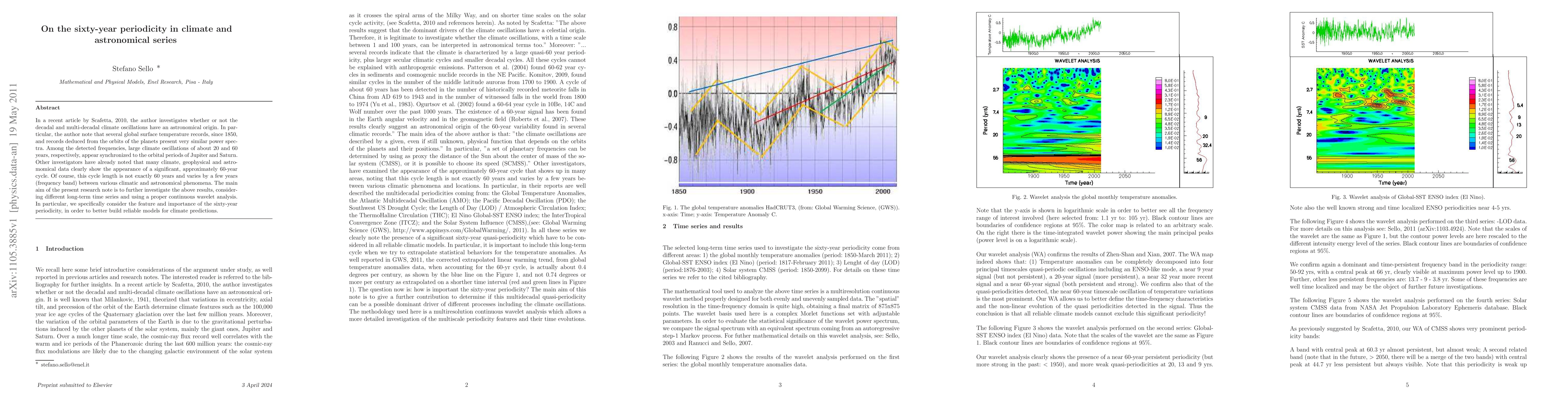 In a recent article by Scafetta, 2010, the author investigates whether or not the decadal and multi-decadal climate oscillations have an astronomical origin. In particular, the author note that several global surface temperature records, since 1850, and records deduced from the orbits of the planets present very similar power spectra. Among the detected frequencies, large climate oscillations of about 20 and 60 years, respectively, appear synchronized to the orbital periods of Jupiter and Saturn. Other investigators have already noted that many climate, geophysical and astromomical data clearly show the appearance of a significant, approximately 60-year cycle. Of course, this cycle length is not exactly 60 years and varies by a few years (frequency band) between various climatic and astronomical phenomena. The main aim of the present research note is to further investigate the above results, considering different long-term time series and using a proper continuous wavelet analysis. In particular, we specifically consider the feature and importance of the sixty-year periodicity, in order to better build reliable models for climate predictions.