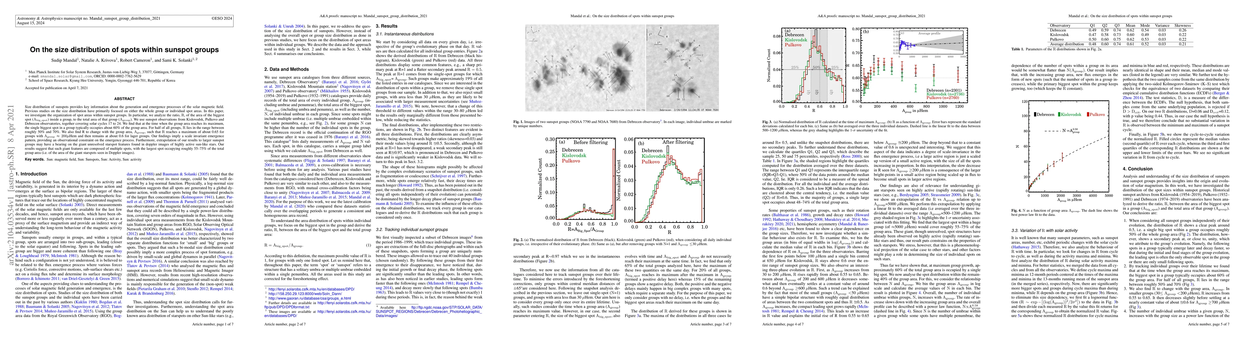 Size distribution of sunspots provides key information about the generation and emergence processes of the solar magnetic field. Previous studies on the size distribution have primarily focused on either the whole group or individual spot areas. In this paper, we investigate the organization of spot areas within sunspot groups. In particular, we analyze the ratio, $\rm{R}$, of the area of the biggest spot ($\rm{A_{big\_spot}}$) inside a group, to the total area of that group ($\rm{A_{group}}$). We use sunspot observations from Kislovodsk, Pulkovo and Debrecen observatories, together covering solar cycles 17 to 24. We find that at the time when the group area reaches its maximum, the single biggest spot in a group typically occupies about 60% of the group area. For half of all groups, $\rm R$ lies in the range between roughly 50% and 70%. We also find R to change with the group area, $\rm{A_{group}}$, such that $\rm{R}$ reaches a maximum of about 0.65 for groups with $\rm{A_{group}}\approx 200\mu$Hem and then remains at about 0.6 for lager groups. Our findings imply a scale invariant emergence pattern, providing an observational constraint on the emergence process. Furthermore, extrapolation of our results to larger sunspot groups may have a bearing on the giant unresolved starspot features found in Doppler images of highly active sun-like stars. Our results suggest that such giant features are composed of multiple spots, with the largest spot occupying roughly 55--75% of the total group area (i.e. of the area of the giant starspots seen in Doppler images).