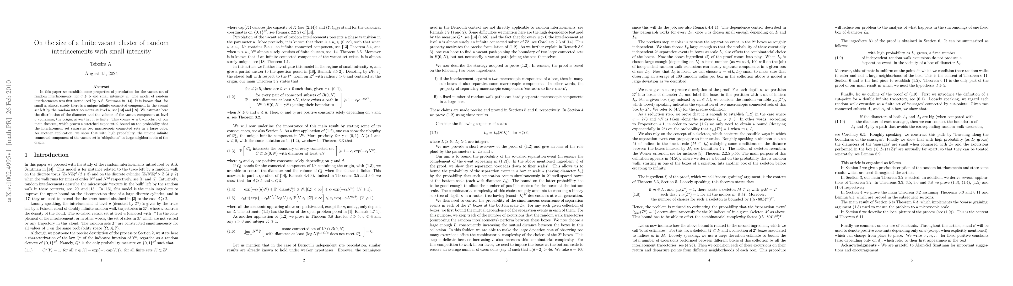 This paper investigates the properties of the vacant set in random interlacements, focusing on the size, diameter, and volume of the unique infinite connected component at small intensity. The authors establish a stretched exponential bound on the probability of separation by the interlacement set and demonstrate that this component is ubiquitous in large neighborhoods of the origin.