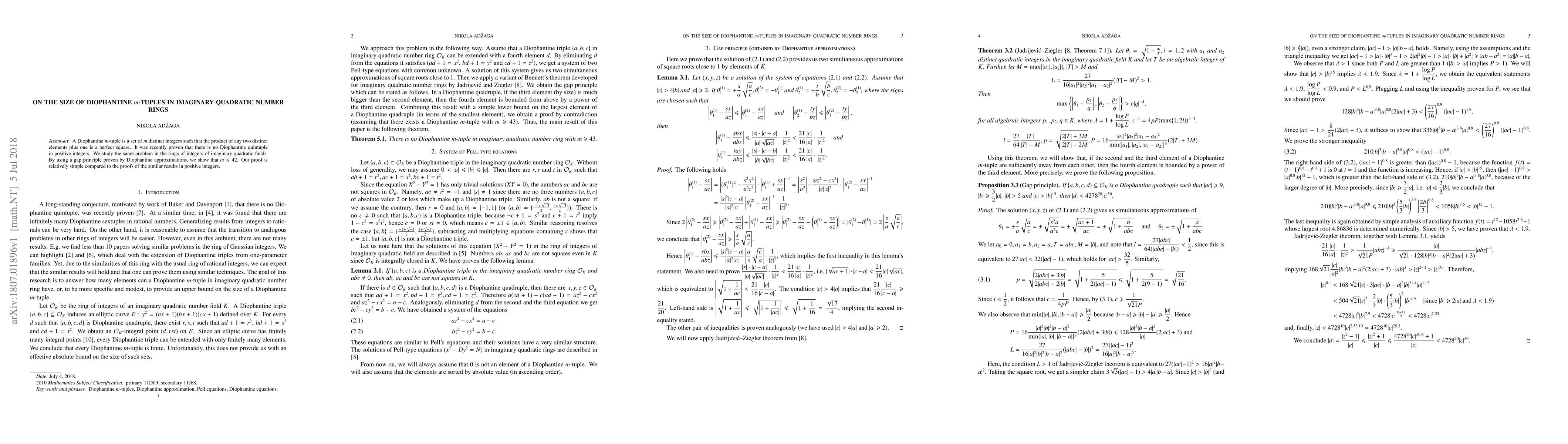 This paper proves that in imaginary quadratic number rings, there exists a Diophantine m-tuple with at most 42 elements, while no such tuple exists for quintuples in positive integers.