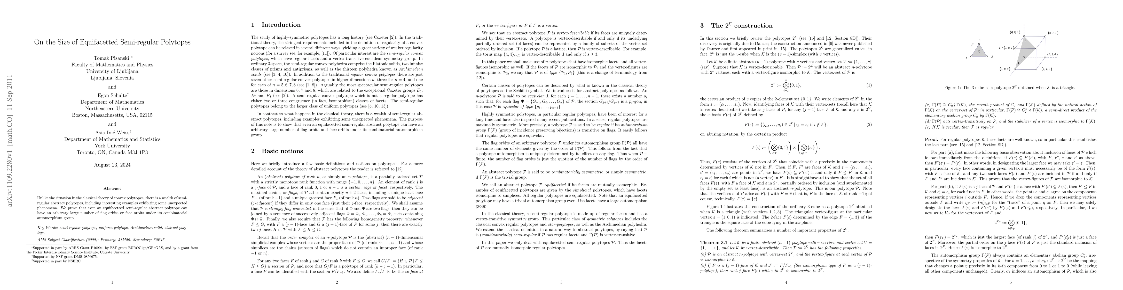 Unlike the situation in the classical theory of convex polytopes, there is a wealth of semi-regular abstract polytopes, including interesting examples exhibiting some unexpected phenomena. We prove that even an equifacetted semi-regular abstract polytope can have an arbitrary large number of flag orbits or face orbits under its combinatorial automorphism group.