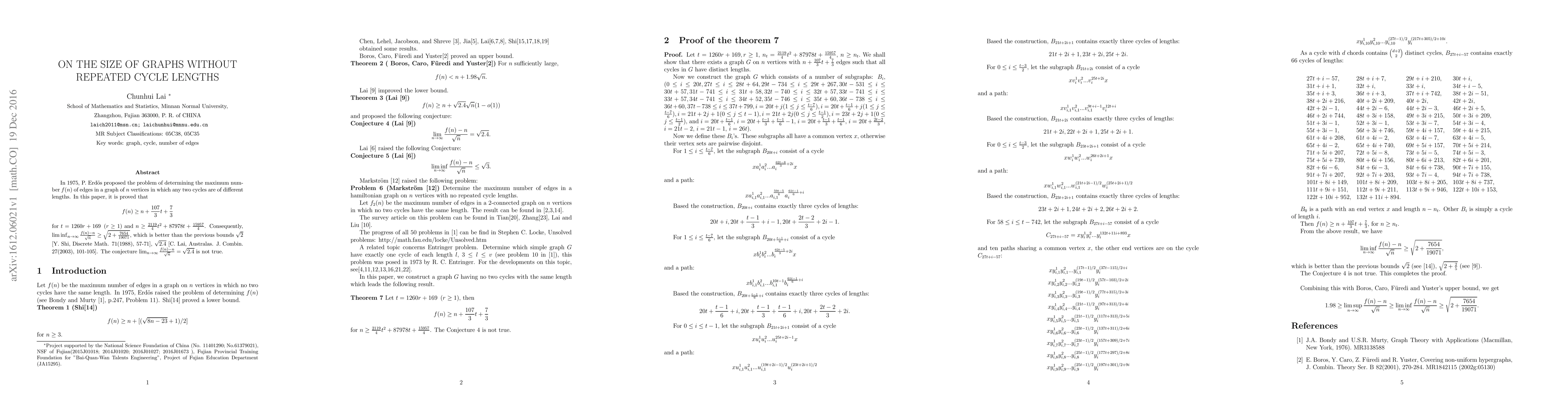 In 1975, P. Erd\"os proposed the problem of determining the maximum number $f(n)$ of edges in a graph of $n$ vertices in which any two cycles are of different lengths. In this paper, it is proved that $$f(n)\geq n+\frac{107}{3}t+\frac{7}{3}$$ for $t=1260r+169 \,\ (r\geq 1)$ and $n \geq \frac{2119}{4}t^{2}+87978t+\frac{15957}{4}$. Consequently, $\lim \inf_{n \to \infty} {f(n)-n \over \sqrt n} \geq \sqrt {2 + \frac{7654}{19071}},$ which is better than the previous bounds $\sqrt 2$ [Y. Shi, Discrete Math. 71(1988), 57-71], $\sqrt {2.4}$ [C. Lai, Australas. J. Combin. 27(2003), 101-105]. The conjecture $\lim_{n \rightarrow \infty} {f(n)-n\over \sqrt n}=\sqrt {2.4}$ is not true.
