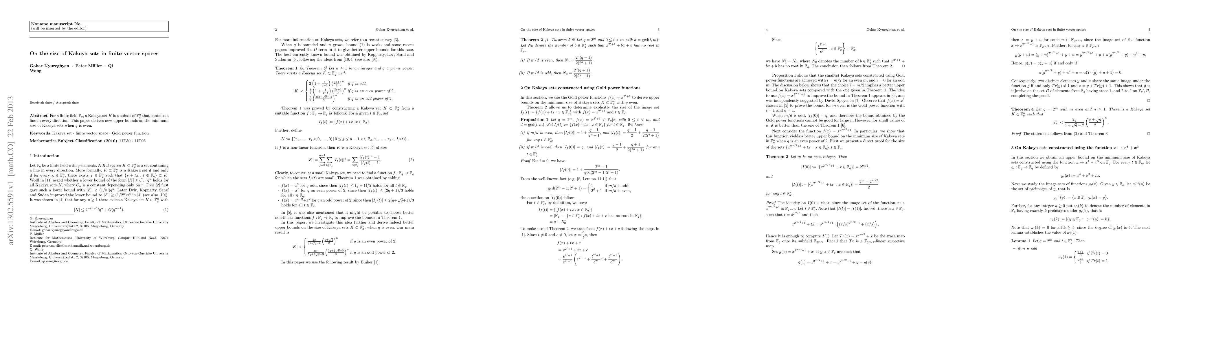 This paper establishes new upper bounds on the minimum size of Kakeya sets in finite vector spaces over GF(q) when q is even, focusing on subsets that contain a line in every direction. The results provide significant improvements over previous estimates.