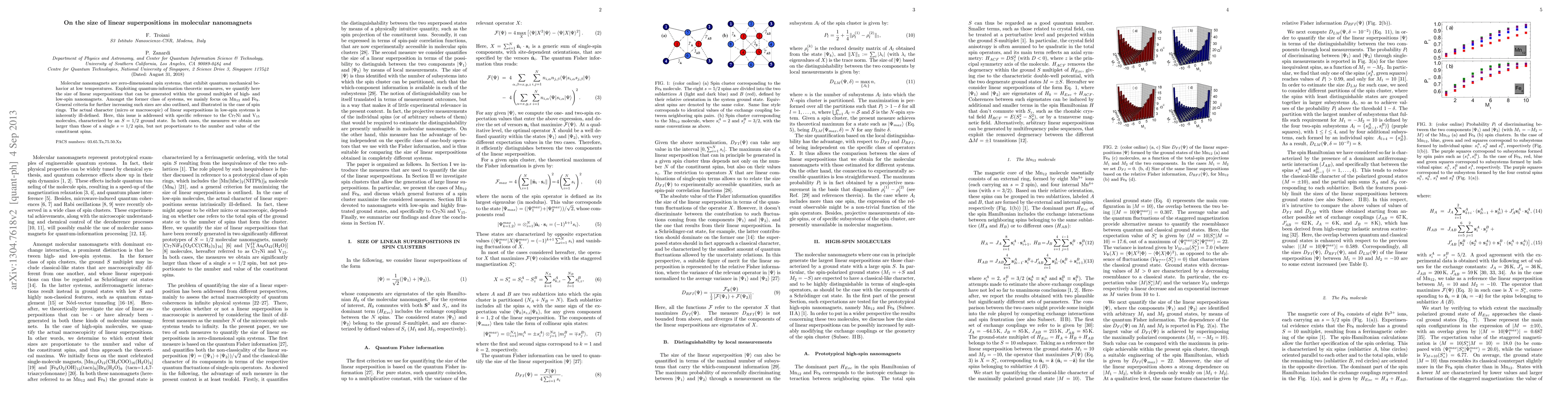 Molecular nanomagnets are zero-dimensional spin systems, that exhibit quantum mechanical behavior at low temperatures. Exploiting quantum-information theoretic measures, we quantify here the size of linear superpositions that can be generated within the ground multiplet of high- and low-spin nanomagnets. Amongst the former class of systems, we mainly focus on Mn12 and Fe8. General criteria for further increasing such sizes are also outlined, and illustrated in the case of spin rings. The actual character (micro or macroscopic) of linear superpositions in low-spin systems is inherently ill-defined. Here, this issue is addressed with specific reference to the Cr7Ni and V15 molecules, characterized by an S=1/2 ground state. In both cases, the measures we obtain are larger than those of a single s=1/2 spin, but not proportionate to the number and value of the constituent spins.