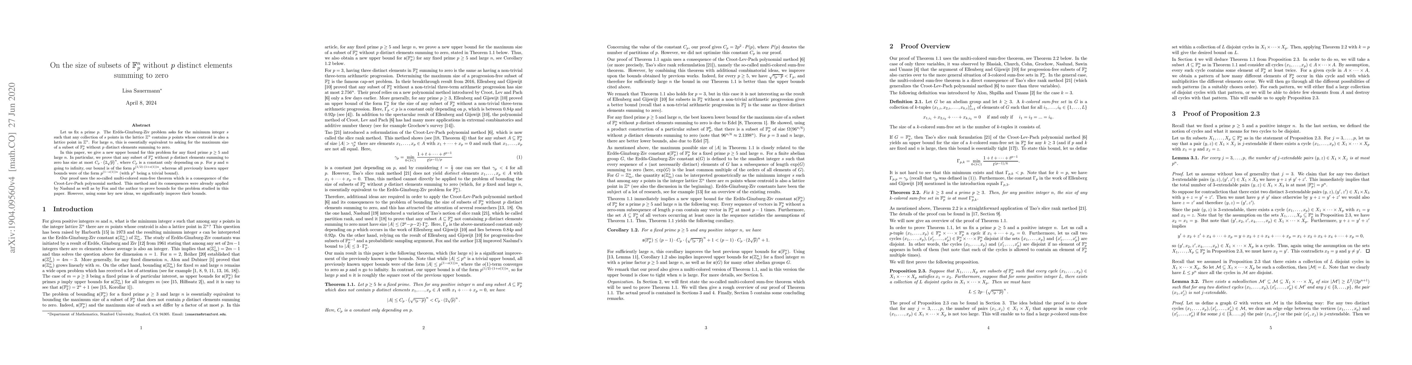 Let us fix a prime $p$. The Erd\H{o}s-Ginzburg-Ziv problem asks for the minimum integer $s$ such that any collection of $s$ points in the lattice $\mathbb{Z}^n$ contains $p$ points whose centroid is also a lattice point in $\mathbb{Z}^n$. For large $n$, this is essentially equivalent to asking for the maximum size of a subset of $\mathbb{F}_p^n$ without $p$ distinct elements summing to zero. In this paper, we give a new upper bound for this problem for any fixed prime $p\geq 5$ and large $n$. In particular, we prove that any subset of $\mathbb{F}_p^n$ without $p$ distinct elements summing to zero has size at most $C_p\cdot \left(2\sqrt{p}\right)^n$, where $C_p$ is a constant only depending on $p$. For $p$ and $n$ going to infinity, our bound is of the form $p^{(1/2)\cdot (1+o(1))n}$, whereas all previously known upper bounds were of the form $p^{(1-o(1))n}$ (with $p^n$ being a trivial bound). Our proof uses the so-called multi-colored sum-free theorem which is a consequence of the Croot-Lev-Pach polynomial method. This method and its consequences were already applied by Naslund as well as by Fox and the author to prove bounds for the problem studied in this paper. However, using some key new ideas, we significantly improve their bounds.