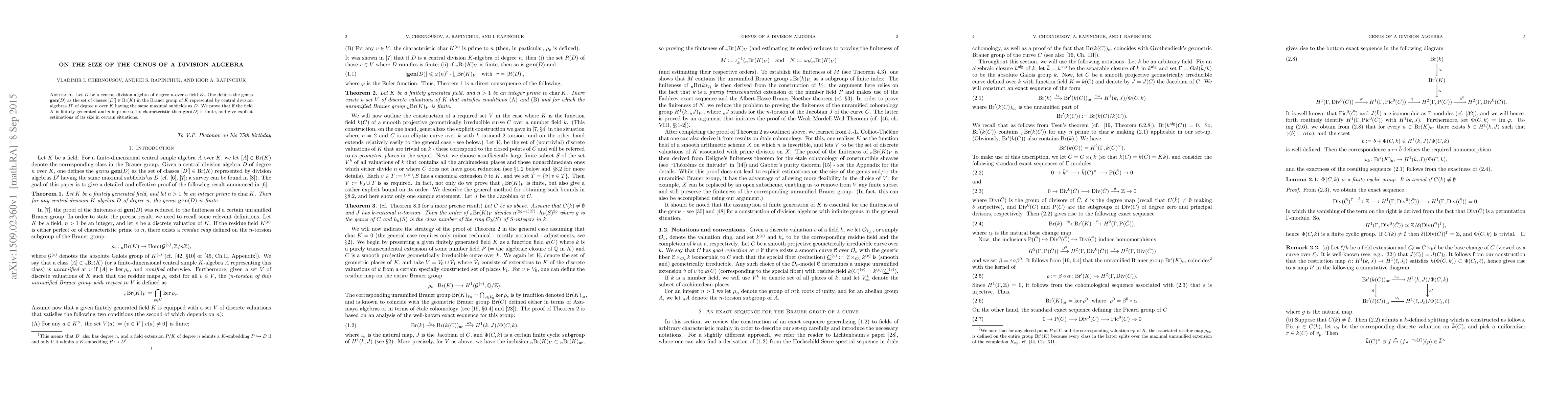 This paper proves that for a finitely generated field K and a central division algebra D of degree n prime to the field's characteristic, the genus gen(D) of D is finite. It also provides explicit estimations for the size of this genus under certain conditions.