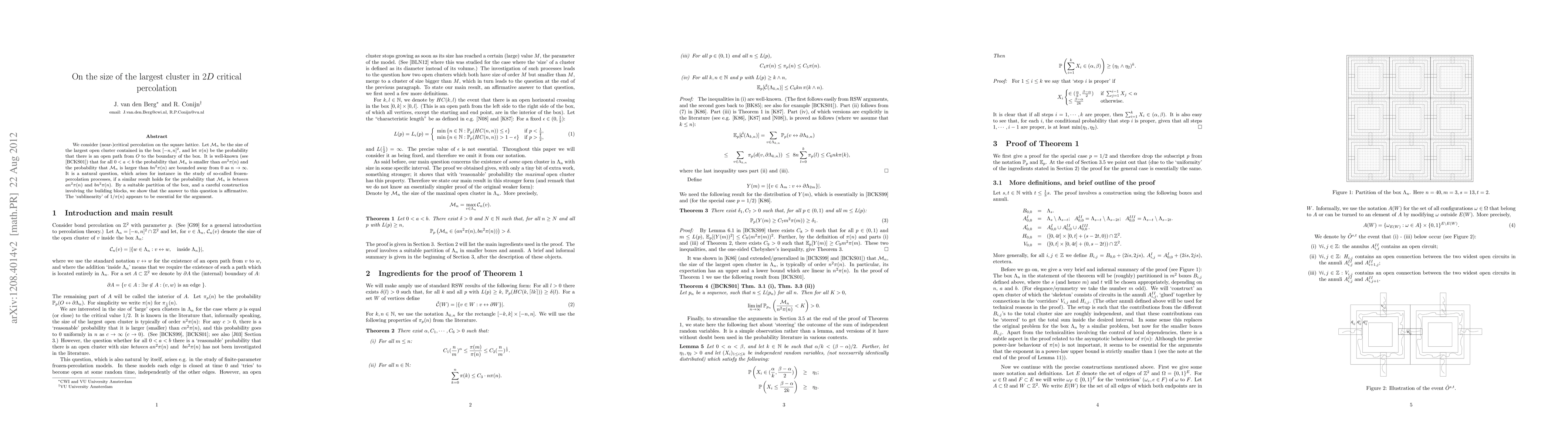 We consider (near-)critical percolation on the square lattice. Let M_n be the size of the largest open cluster contained in the box [-n,n]^2, and let pi(n) be the probability that there is an open path from O to the boundary of the box. It is well-known that for all 0< a < b the probability that M_n is smaller than an^2 pi(n) and the probability that M_n is larger than bn^2 pi(n) are bounded away from 0 as n tends to infinity. It is a natural question, which arises for instance in the study of so-called frozen-percolation processes, if a similar result holds for the probability that M_n is between an^2 pi(n) and bn^2 pi(n). By a suitable partition of the box, and a careful construction involving the building blocks, we show that the answer to this question is affirmative. The `sublinearity' of 1/pi(n) appears to be essential for the argument.