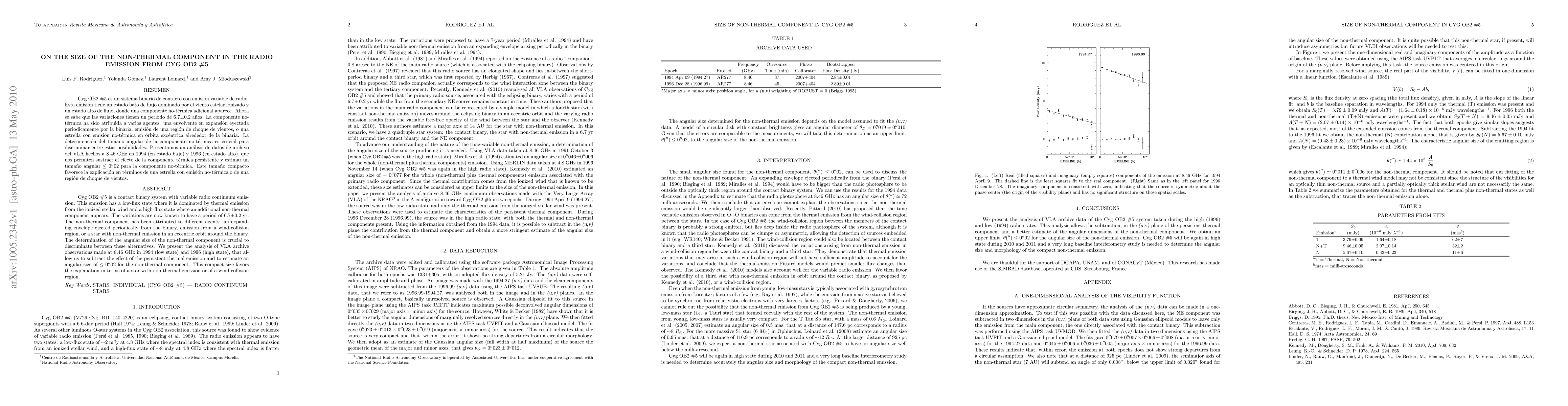 Cyg OB2 #5 is a contact binary system with variable radio continuum emission. This emission has a low-flux state where it is dominated by thermal emission from the ionized stellar wind and a high-flux state where an additional non-thermal component appears. The variations are now known to have a period of 6.7 +/- 0.2 yr. The non-thermal component has been attributed to different agents: an expanding envelope ejected periodically from the binary, emission from a wind-collision region, or a star with non-thermal emission in an eccentric orbit around the binary. The determination of the angular size of the non-thermal component is crucial to discriminate between these alternatives. We present the analysis of VLA archive observations made at 8.46 GHz in 1994 (low state) and 1996 (high state), that allow us to subtract the effect of the persistent thermal emission and to estimate an angular size of 0.02 arcseconds for the non-thermal component. This compact size favors the explanation in terms of a star with non-thermal emission or of a wind-collision region.