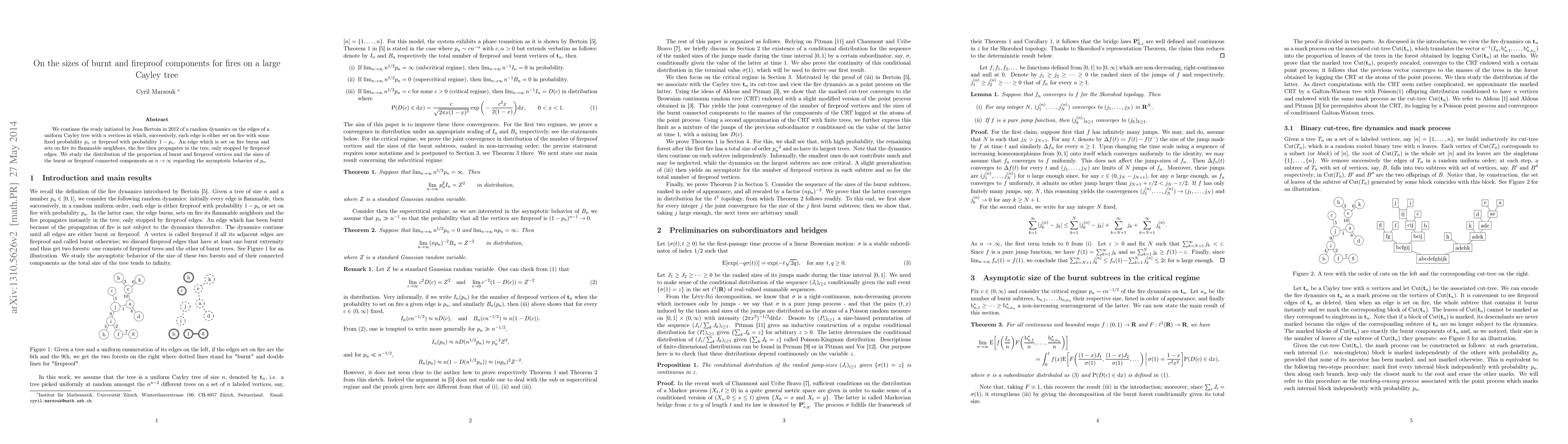 We continue the study initiated by Jean Bertoin in 2012 of a random dynamics on the edges of a uniform Cayley tree with $n$ vertices in which, successively, each edge is either set on fire with some fixed probability $p_n$ or fireproof with probability $1-p_n$. An edge which is set on fire burns and sets on fire its flammable neighbors, the fire then propagates in the tree, only stopped by fireproof edges. We study the distribution of the proportion of burnt and fireproof vertices and the sizes of the burnt or fireproof connected components as $n \to \infty$ regarding the asymptotic behavior of $p_n$.