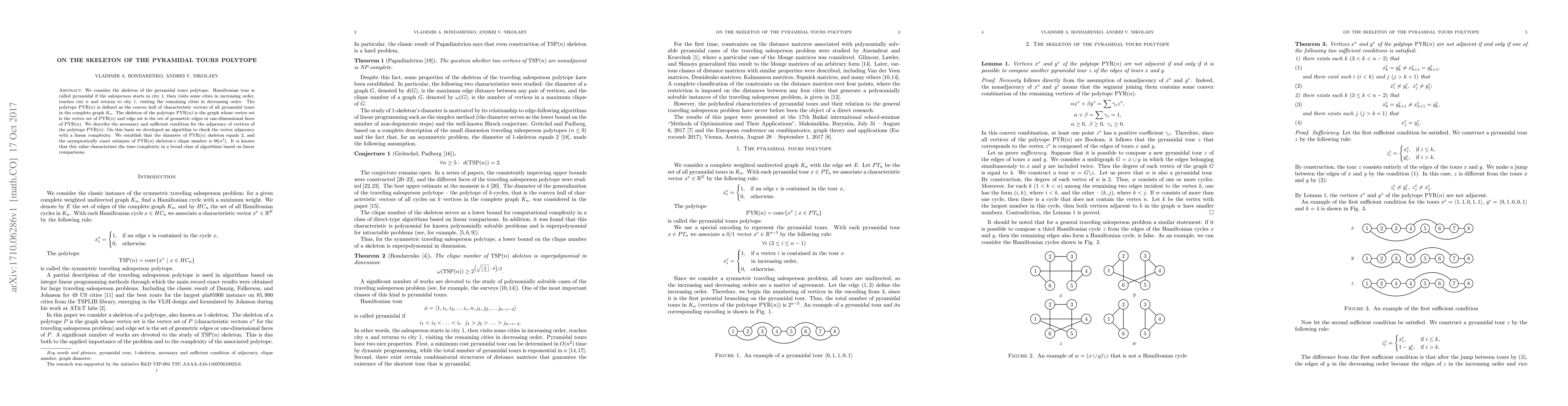 The paper studies the skeleton of the pyramidal tours polytope, a graph formed from characteristic vectors of all pyramidal tours in a complete graph. It establishes that the diameter of this graph equals 2 and provides an asymptotically exact estimate of its clique number as $ heta(n^2)$.