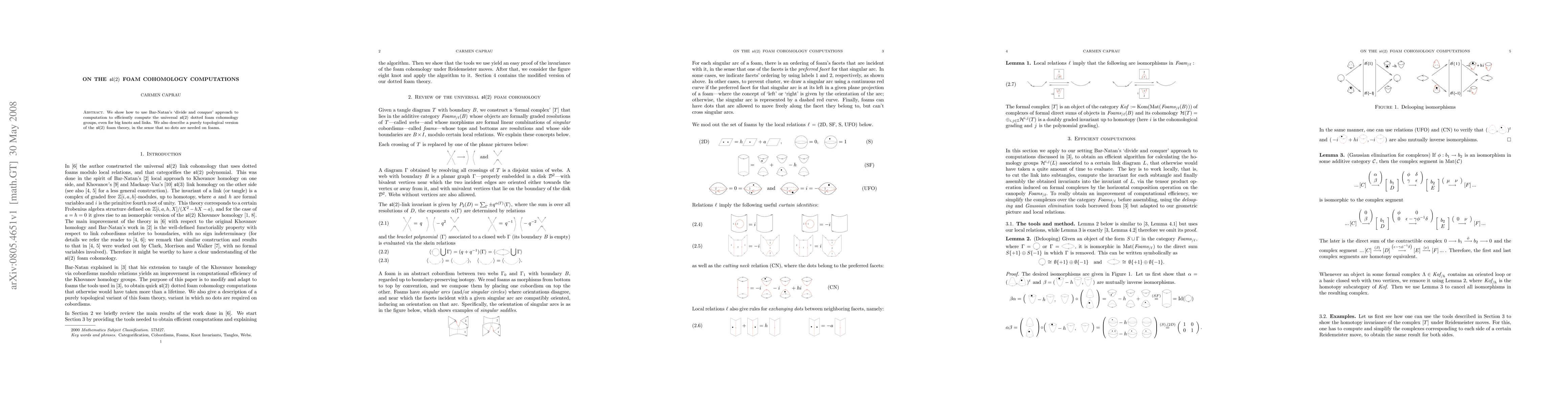 We show how to use Bar-Natan's `divide and conquer' approach to computations to efficiently compute the universal sl(2) dotted foam cohomology groups, even for big knots and links. We also describe a purely topological version of the sl(2) foam theory, in the sense that no dots are needed on foams.