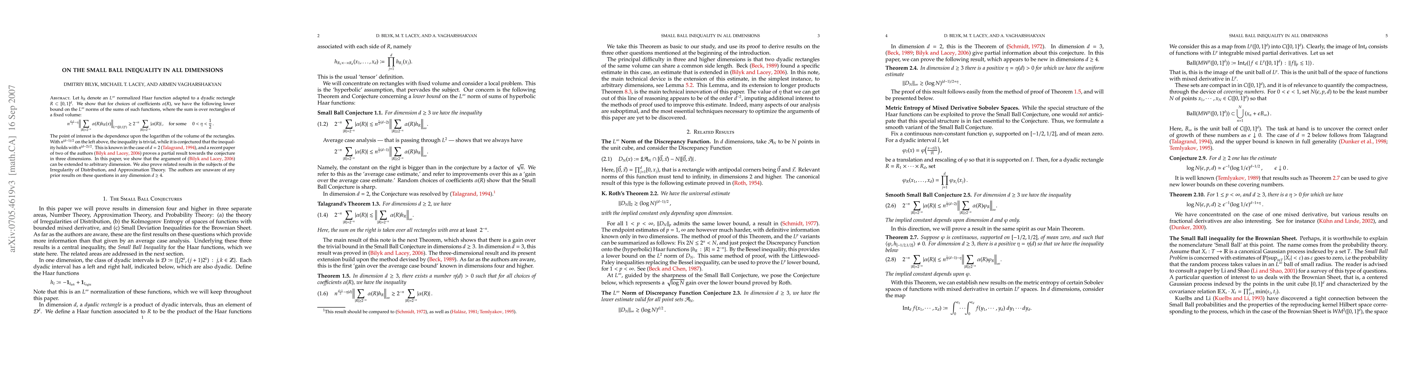 Let h_R denote an L ^{\infty} normalized Haar function adapted to a dyadic rectangle R contained in the unit cube in dimension d. We establish a non-trivial lower bound on the L^{\infty} norm of the `hyperbolic' sums $$ \sum _{|R|=2 ^{-n}} \alpha(R) h_R (x) $$ The lower bound is non-trivial in that we improve the average case bound by n^{\eta} for some positive \eta, a function of dimension d. As far as the authors know, this is the first result of this type in dimension 4 and higher. This question is related to Conjectures in (1) Irregularity of Distributions, (2) Approximation Theory and (3) Probability Theory. The method of proof of this paper gives new results on these conjectures in all dimensions 4 and higher. This paper builds upon prior work of Jozef Beck, from 1989, and first two authors from 2006. These results were of the same nature, but only in dimension 3.