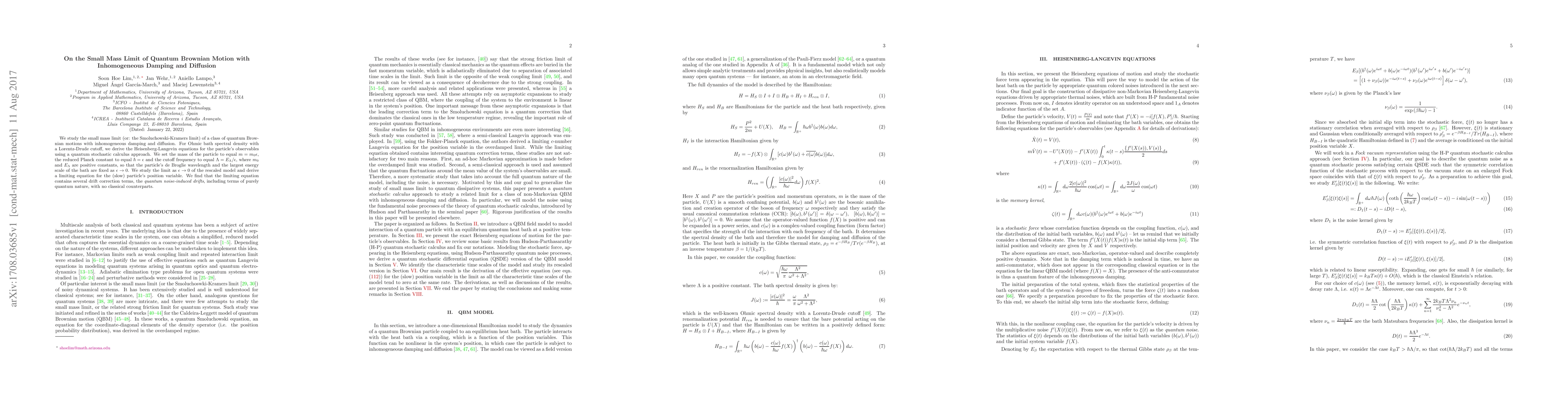 We study the small mass limit (or: the Smoluchowski-Kramers limit) of a class of quantum Brownian motions with inhomogeneous damping and diffusion. For Ohmic bath spectral density with a Lorentz-Drude cutoff, we derive the Heisenberg-Langevin equations for the particle's observables using a quantum stochastic calculus approach. We set the mass of the particle to equal $m = m_{0} \epsilon$, the reduced Planck constant to equal $\hbar = \epsilon$ and the cutoff frequency to equal $\Lambda = E_{\Lambda}/\epsilon$, where $m_0$ and $E_{\Lambda}$ are positive constants, so that the particle's de Broglie wavelength and the largest energy scale of the bath are fixed as $\epsilon \to 0$. We study the limit as $\epsilon \to 0$ of the rescaled model and derive a limiting equation for the (slow) particle's position variable. We find that the limiting equation contains several drift correction terms, the quantum noise-induced drifts, including terms of purely quantum nature, with no classical counterparts.