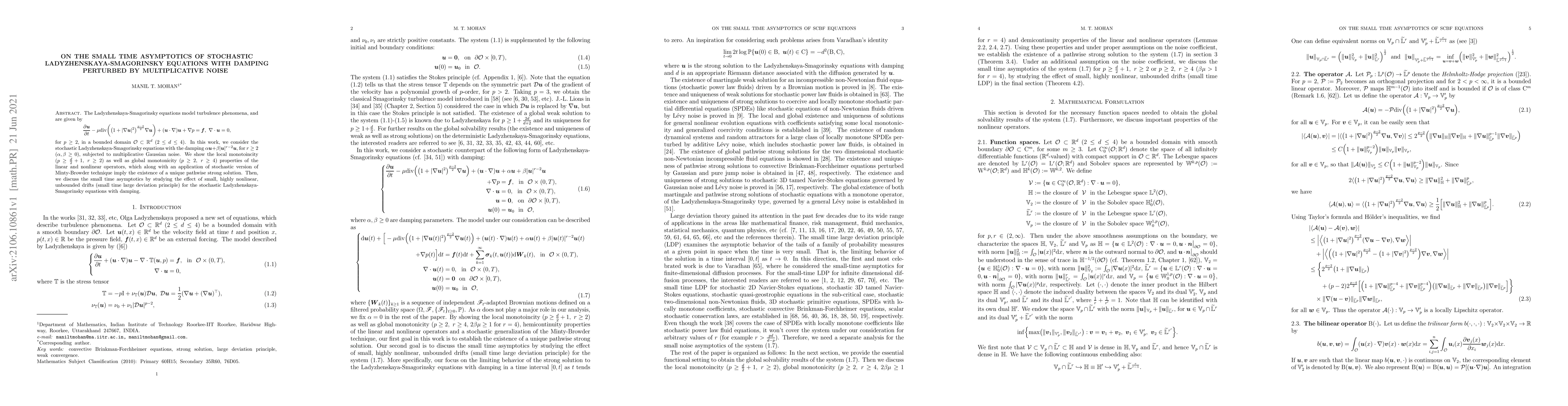 This research paper investigates the small time asymptotics of stochastic Ladyzhenskaya-Smagorinsky equations with damping perturbed by multiplicative noise, showing existence and unique pathwise strong solutions for specific conditions on parameters p and r.