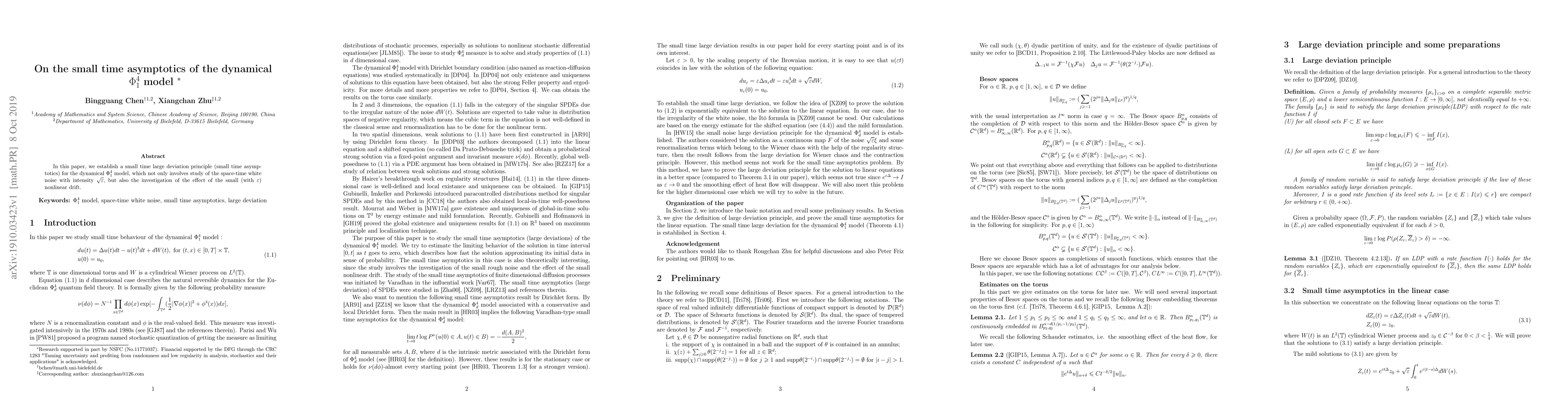 This paper establishes a small time large deviation principle for the dynamical $oxed{ ext{θ}^4_1}$ model, which studies the space-time white noise with intensity ω and a small nonlinear drift.