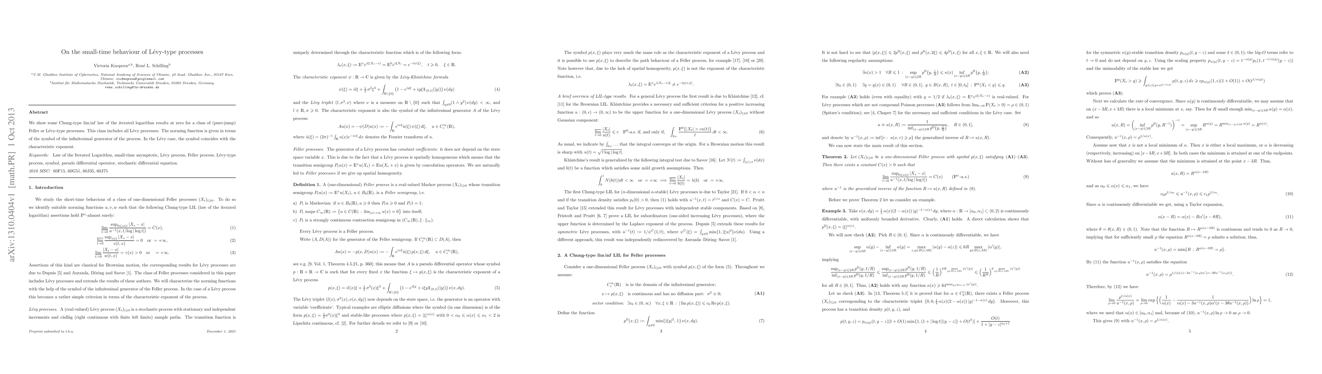 We show some Chung-type $\liminf$ law of the iterated logarithm results at zero for a class of (pure-jump) Feller or L\'evy-type processes. This class includes all L\'evy processes. The norming function is given in terms of the symbol of the infinitesimal generator of the process. In the L\'evy case, the symbol coincides with the characteristic exponent.