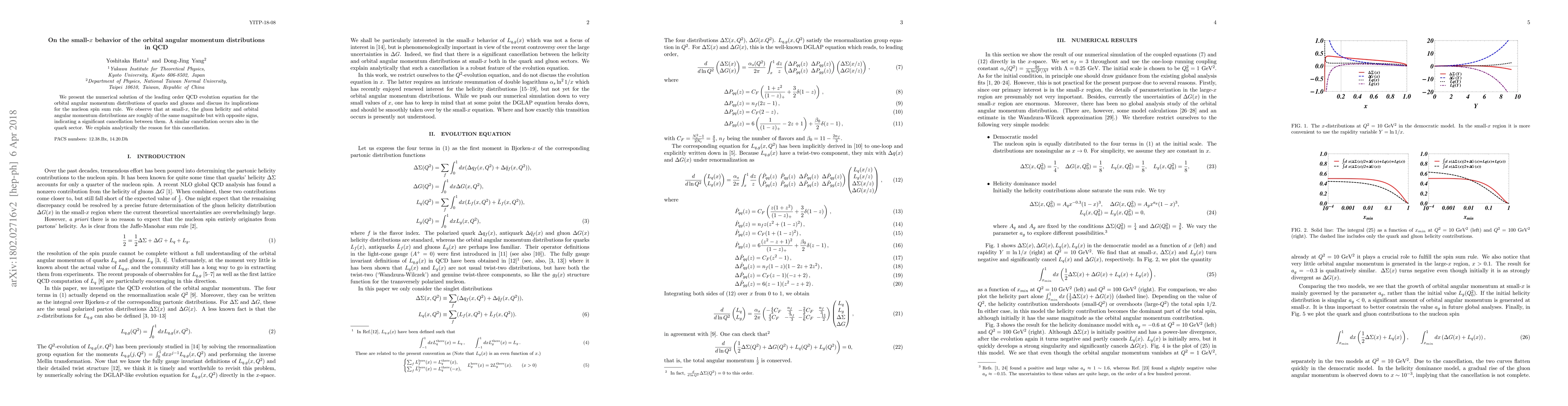 This paper numerically solves the leading order QCD evolution equation for quark and gluon orbital angular momentum distributions, revealing significant cancellation at small-$x$ between the gluon helicity and orbital angular momentum distributions, with a similar effect observed in the quark sector. The authors provide an analytical explanation for this observed cancellation.