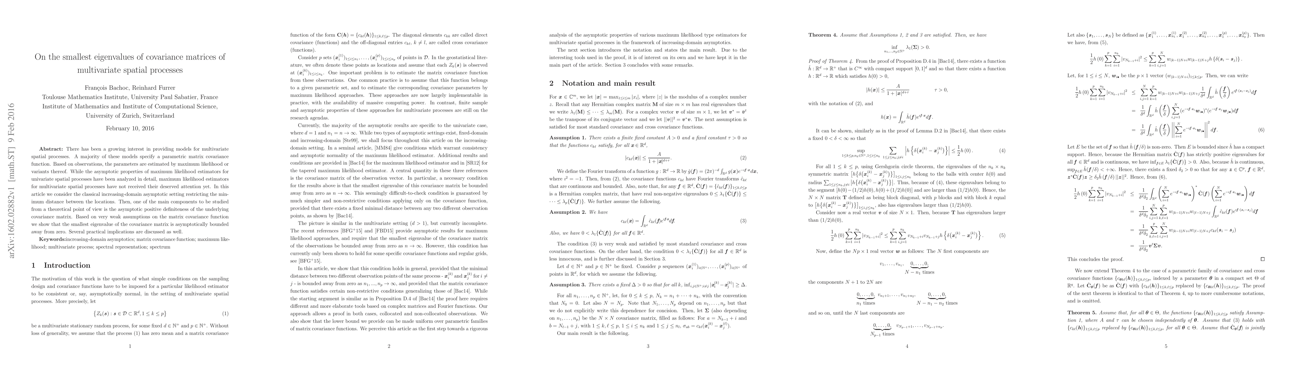 There has been a growing interest in providing models for multivariate spatial processes. A majority of these models specify a parametric matrix covariance function. Based on observations, the parameters are estimated by maximum likelihood or variants thereof. While the asymptotic properties of maximum likelihood estimators for univariate spatial processes have been analyzed in detail, maximum likelihood estimators for multivariate spatial processes have not received their deserved attention yet. In this article we consider the classical increasing-domain asymptotic setting restricting the minimum distance between the locations. Then, one of the main components to be studied from a theoretical point of view is the asymptotic positive definiteness of the underlying covariance matrix. Based on very weak assumptions on the matrix covariance function we show that the smallest eigenvalue of the covariance matrix is asymptotically bounded away from zero. Several practical implications are discussed as well.