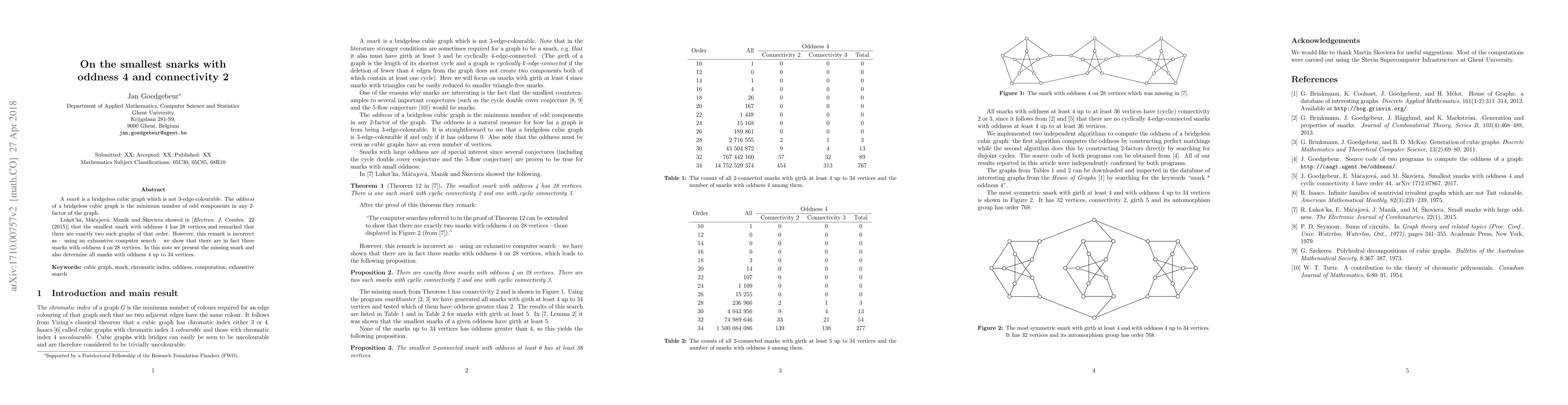 A snark is a bridgeless cubic graph which is not 3-edge-colourable. The oddness of a bridgeless cubic graph is the minimum number of odd components in any 2-factor of the graph. Lukot'ka, M\'acajov\'a, Maz\'ak and \v{S}koviera showed in [Electron. J. Combin. 22 (2015)] that the smallest snark with oddness 4 has 28 vertices and remarked that there are exactly two such graphs of that order. However, this remark is incorrect as -- using an exhaustive computer search -- we show that there are in fact three snarks with oddness 4 on 28 vertices. In this note we present the missing snark and also determine all snarks with oddness 4 up to 34 vertices.
