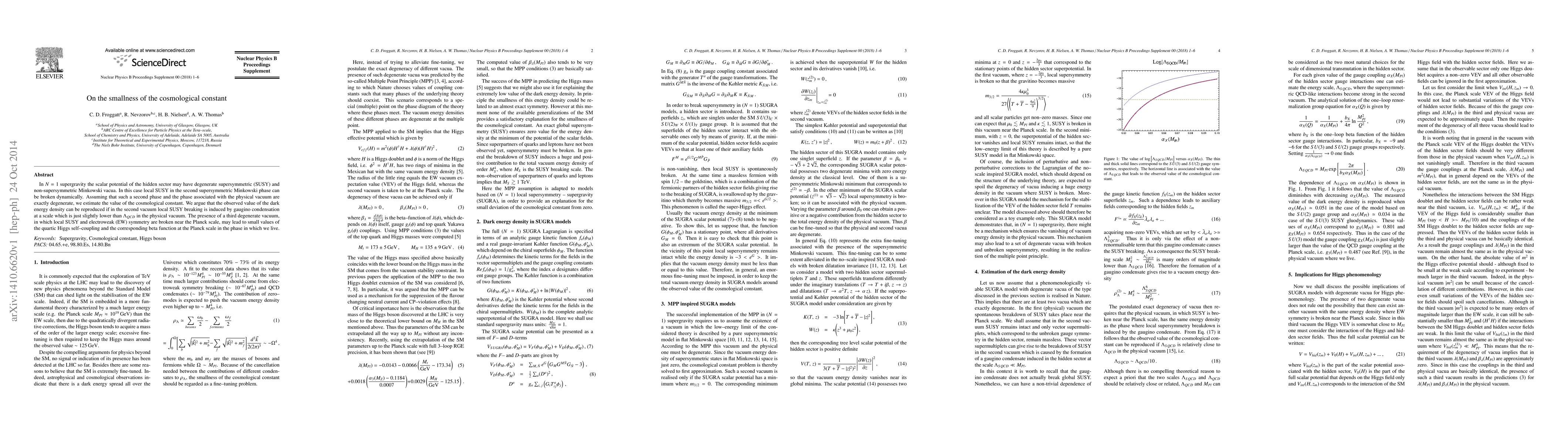 In N=1 supergravity the scalar potential of the hidden sector may have degenerate supersymmetric (SUSY) and non-supersymmetric Minkowski vacua. In this case local SUSY in the second supersymmetric Minkowski phase can be broken dynamically. Assuming that such a second phase and the phase associated with the physical vacuum are exactly degenerate, we estimate the value of the cosmological constant. We argue that the observed value of the dark energy density can be reproduced if in the second vacuum local SUSY breaking is induced by gaugino condensation at a scale which is just slightly lower than \Lambda_{QCD} in the physical vacuum. The presence of a third degenerate vacuum, in which local SUSY and electroweak (EW) symmetry are broken near the Planck scale, may lead to small values of the quartic Higgs self--coupling and the corresponding beta function at the Planck scale in the phase in which we live.