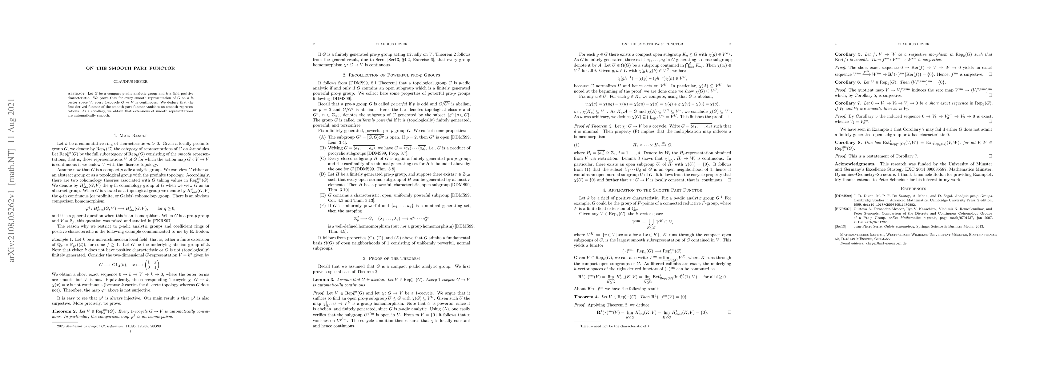 Let $G$ be a compact $p$-adic analytic group and $k$ a field positive characteristic. We prove that for every smooth representation of $G$ on a $k$-vector space $V$, every 1-cocycle $G\to V$ is continuous. We deduce that the first derived functor of the smooth part functor vanishes on smooth representations. As a corollary, we obtain that extensions of smooth representations are automatically smooth.