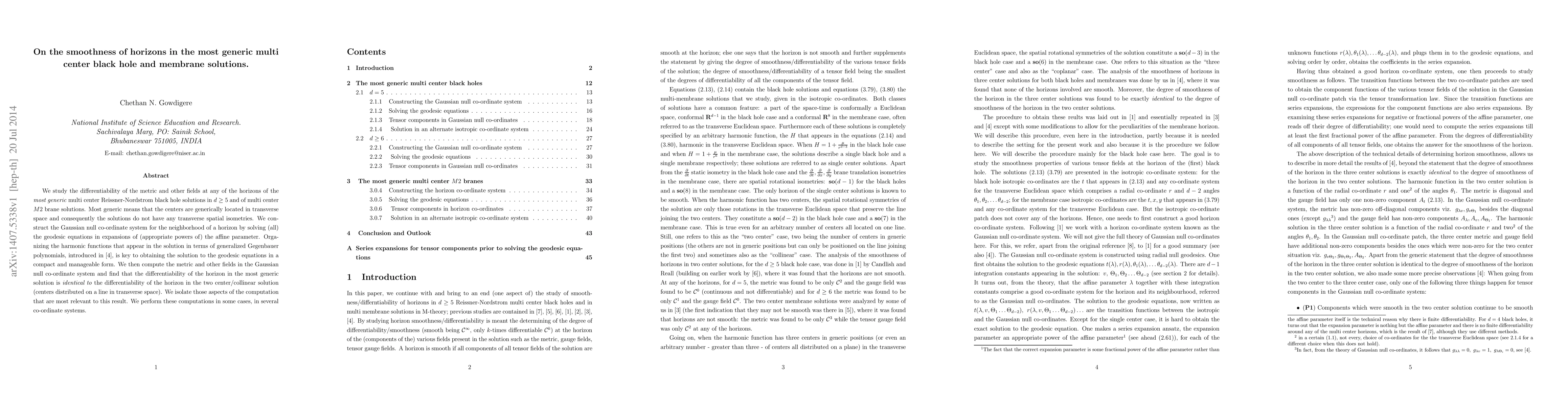 Researchers studied the smoothness of horizons in generic multi-center black hole and membrane solutions, finding that differentiability is identical to a two-center solution, with implications for our understanding of these complex spacetime geometries.