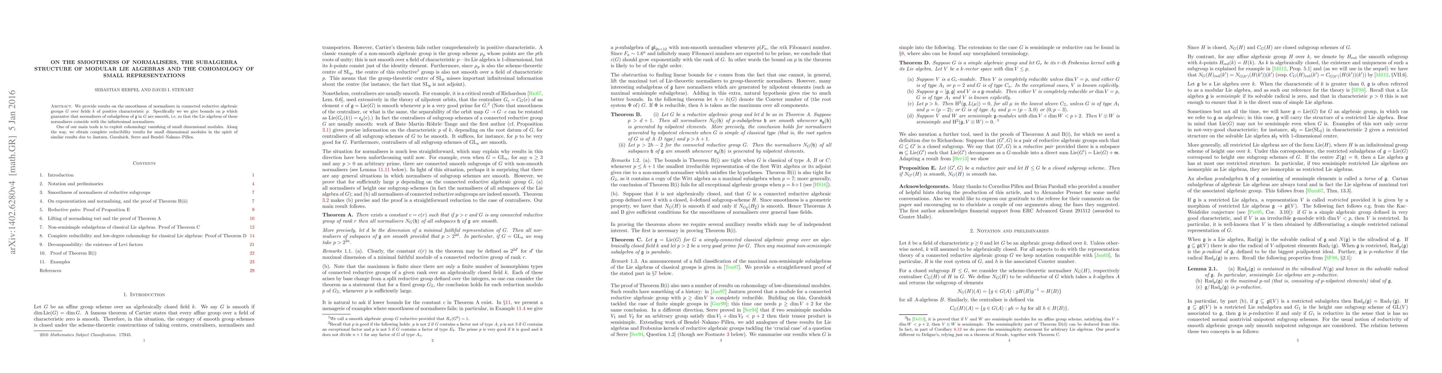 We provide results on the smoothness of normalisers in connected reductive algebraic groups $G$ over fields $k$ of positive characteristic $p$. Specifically we we give bounds on $p$ which guarantee that normalisers of subalgebras of $\mathfrak{g}$ in $G$ are smooth, i.e.\ so that the Lie algebras of these normalisers coincide with the infinitesimal normalisers. One of our main tools is to exploit cohomology vanishing of small dimensional modules. Along the way, we obtain complete reducibility results for small dimensional modules in the spirit of similar results due to Jantzen, Guralnick, Serre and Bendel--Nakano--Pillen.