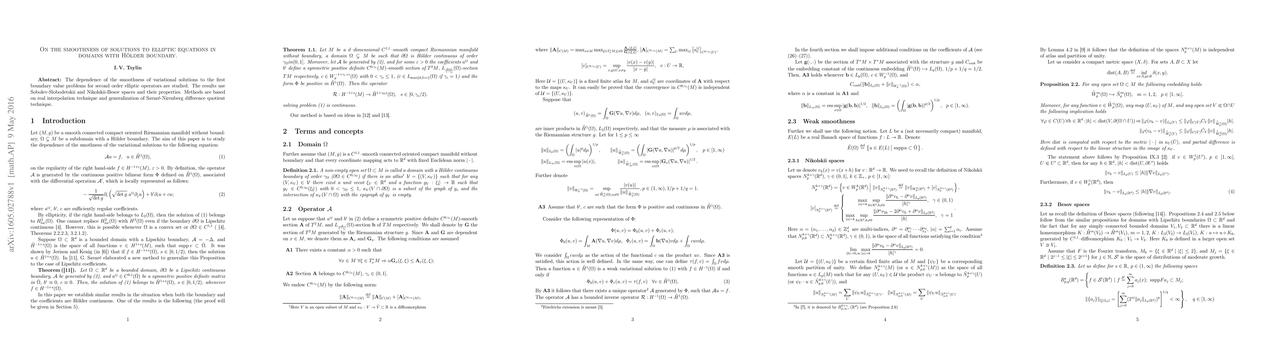 The dependence of the smoothness of variational solutions to the first boundary value problems for second order elliptic operators are studied. The results use Sobolev-Slobodetskii and Nikolskii-Besov spaces and their properties. Methods are based on real interpolation technique and generalization of Savar\'{e}-Nirenberg difference quotient technique.