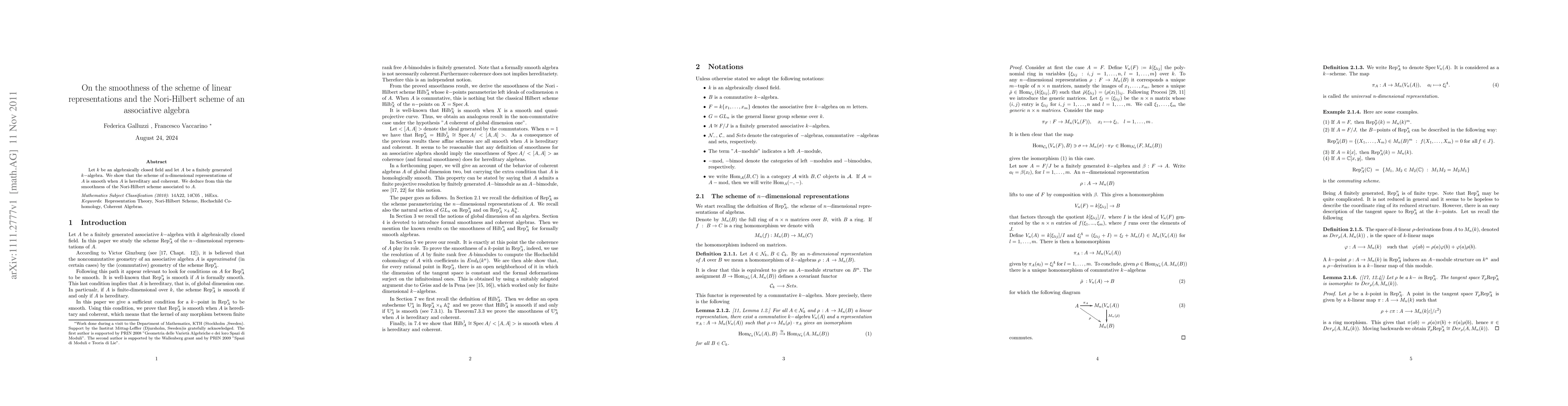 Let $k$ be an algebraically closed field and let $A$ be a finitely generated $k-$algebra. We show that the scheme of n-dimensional representations of $A$ is smooth when $A$ is hereditary and coherent. We deduce from this the smoothness of the Nori-Hilbert scheme associated to $A.$