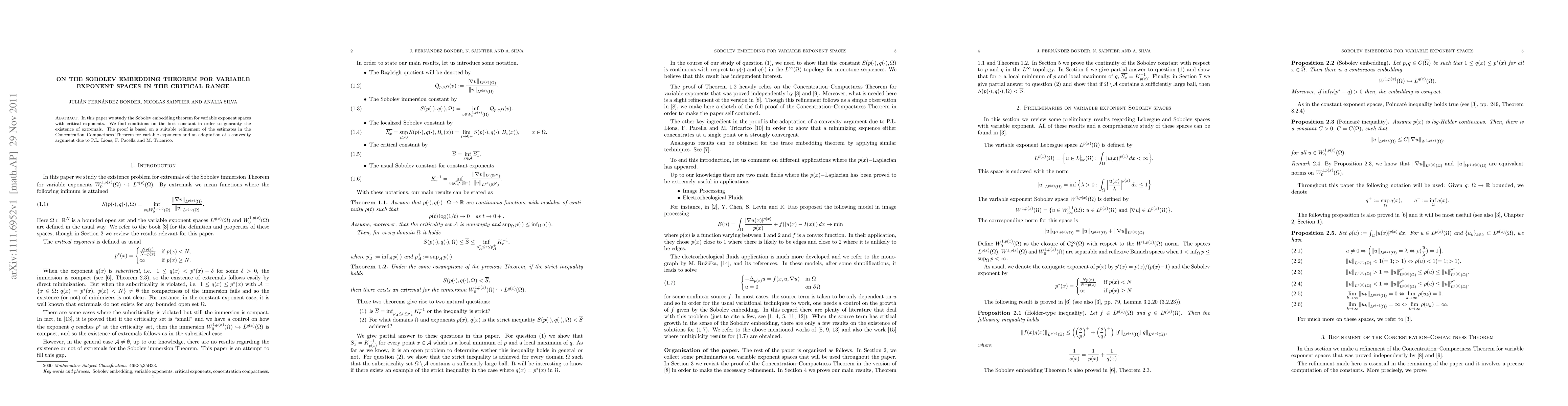 This paper investigates the Sobolev embedding theorem for variable exponent spaces at critical exponents, establishing conditions for the existence of extremals. The proof leverages refined estimates from the Concentration-Compactness Theorem and an adapted convexity argument from the work of P.L. Lions, F. Pacella, and M. Tricarico.
