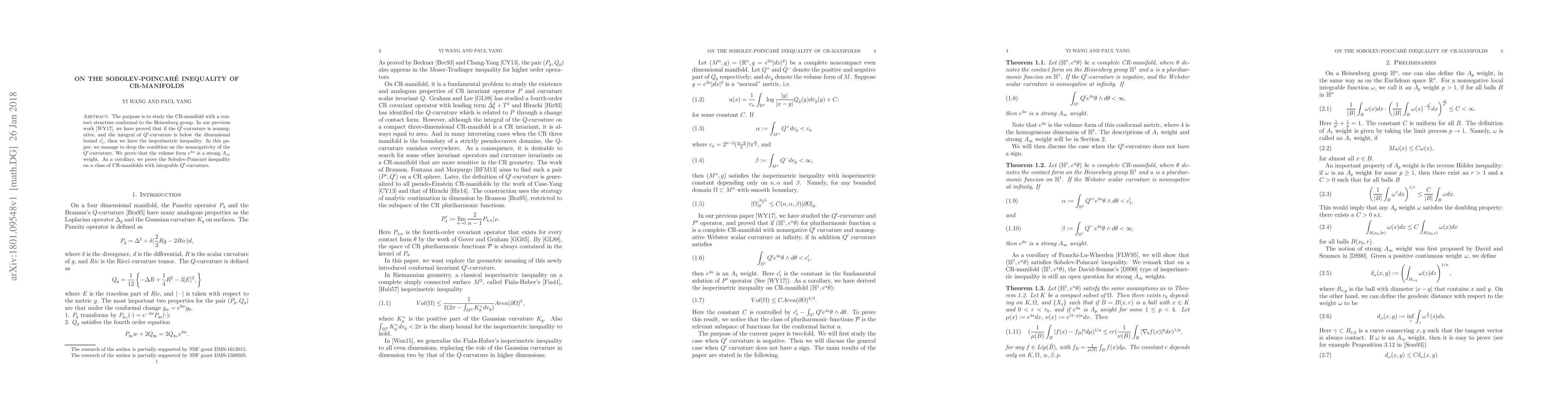 The purpose is to study the CR-manifold with a contact structure conformal to the Heisenberg group. In our previous work \cite{WY}, we have proved that if the $Q'$-curvature is nonnegative, and the integral of $Q'$-curvature is below the dimensional bound $c_1'$, then we have the isoperimetric inequality. In this paper, we manage to drop the condition on the nonnegativity of the $Q'$-curvature. We prove that the volume form $e^{4u}$ is a strong $A_\infty$ weight. As a corollary, we prove the Sobolev-Poincar\'e inequality on a class of CR-manifolds with integrable $Q'$-curvature.