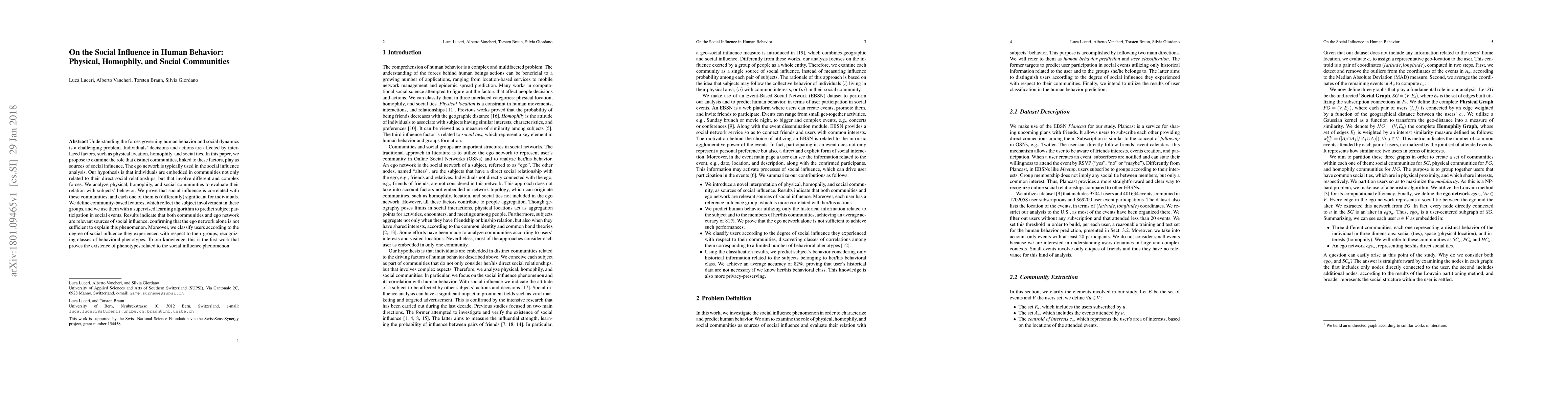 This paper investigates the role of physical, homophily, and social communities in shaping human behavior and social influence, demonstrating that these communities significantly impact individual decision-making. It introduces community-based features to predict participation in social events, showing that both communities and ego networks are crucial, and identifies distinct behavioral phenotypes related to social influence.