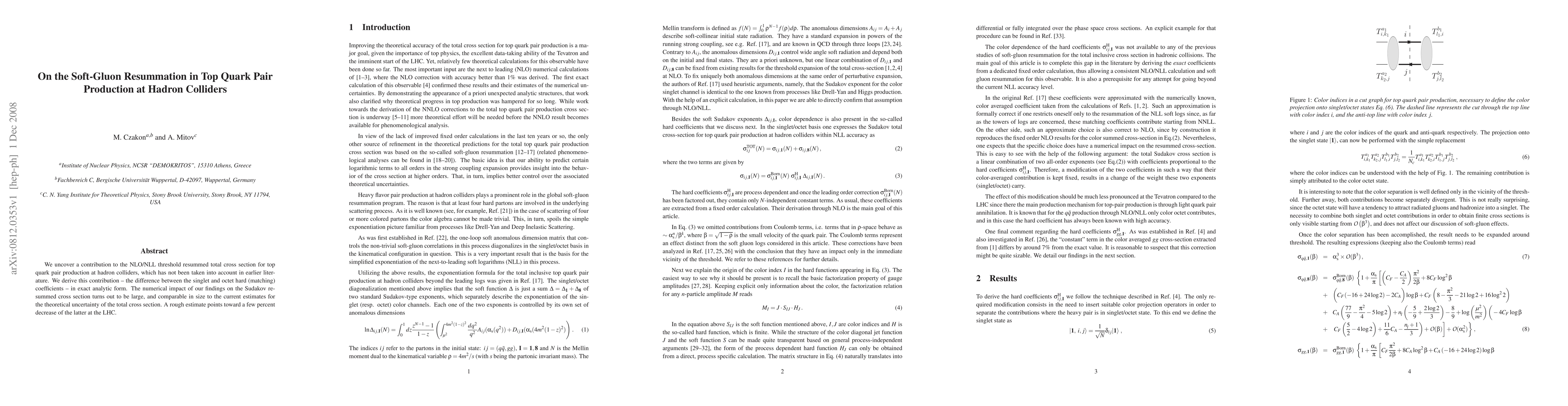 We uncover a contribution to the NLO/NLL threshold resummed total cross section for top quark pair production at hadron colliders, which has not been taken into account in earlier literature. We derive this contribution - the difference between the singlet and octet hard (matching) coefficients - in exact analytic form. The numerical impact of our findings on the Sudakov resummed cross section turns out to be large, and comparable in size to the current estimates for the theoretical uncertainty of the total cross section. A rough estimate points toward a few percent decrease of the latter at the LHC.