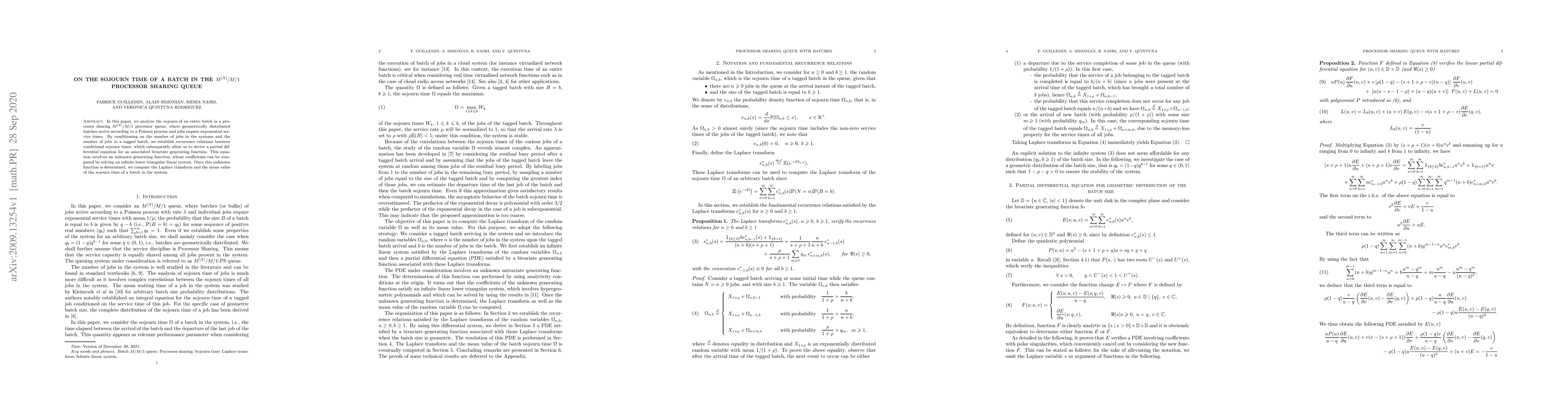 In this paper, we analyze the sojourn of an entire batch in a processor sharing $M^{[X]}/M/1$ processor queue, where geometrically distributed batches arrive according to a Poisson process and jobs require exponential service times. By conditioning on the number of jobs in the systems and the number of jobs in a tagged batch, we establish recurrence relations between conditional sojourn times, which subsequently allow us to derive a partial differential equation for an associated bivariate generating function. This equation involves an unknown generating function, whose coefficients can be computed by solving an infinite lower triangular linear system. Once this unknown function is determined, we compute the Laplace transform and the mean value of the sojourn time of a batch in the system.