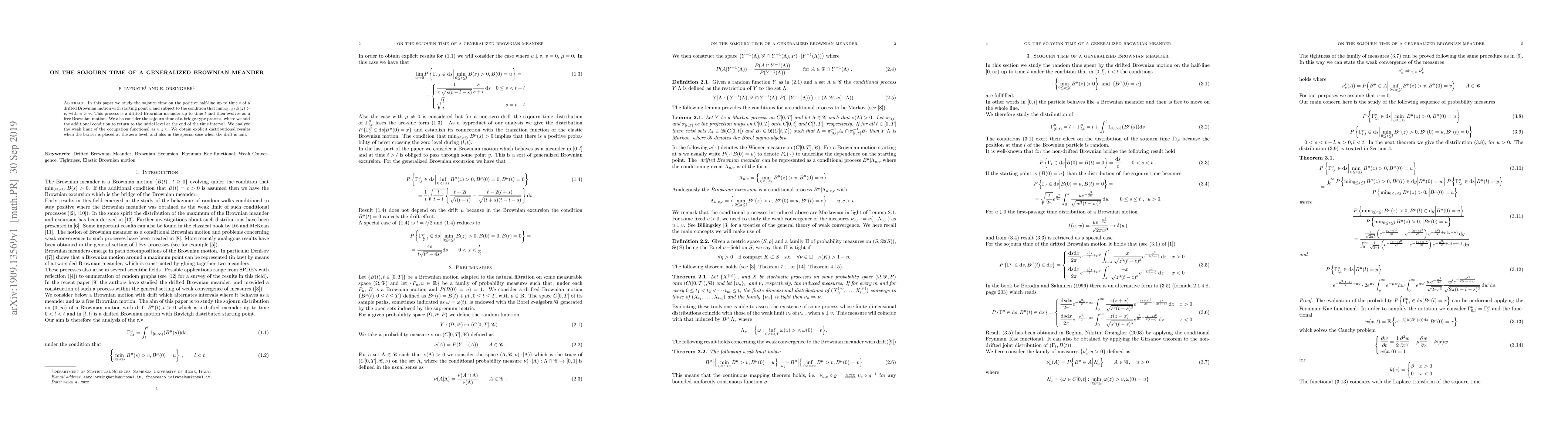 In this paper we study the sojourn time on the positive half-line up to time $ t $ of a drifted Brownian motion with starting point $ u $ and subject to the condition that $ \min_{ 0\leq z \leq l} B(z)> v $, with $ u > v $. This process is a drifted Brownian meander up to time $ l $ and then evolves as a free Brownian motion. We also consider the sojourn time of a bridge-type process, where we add the additional condition to return to the initial level at the end of the time interval. We analyze the weak limit of the occupation functional as $ u \downarrow v $. We obtain explicit distributional results when the barrier is placed at the zero level, and also in the special case when the drift is null.