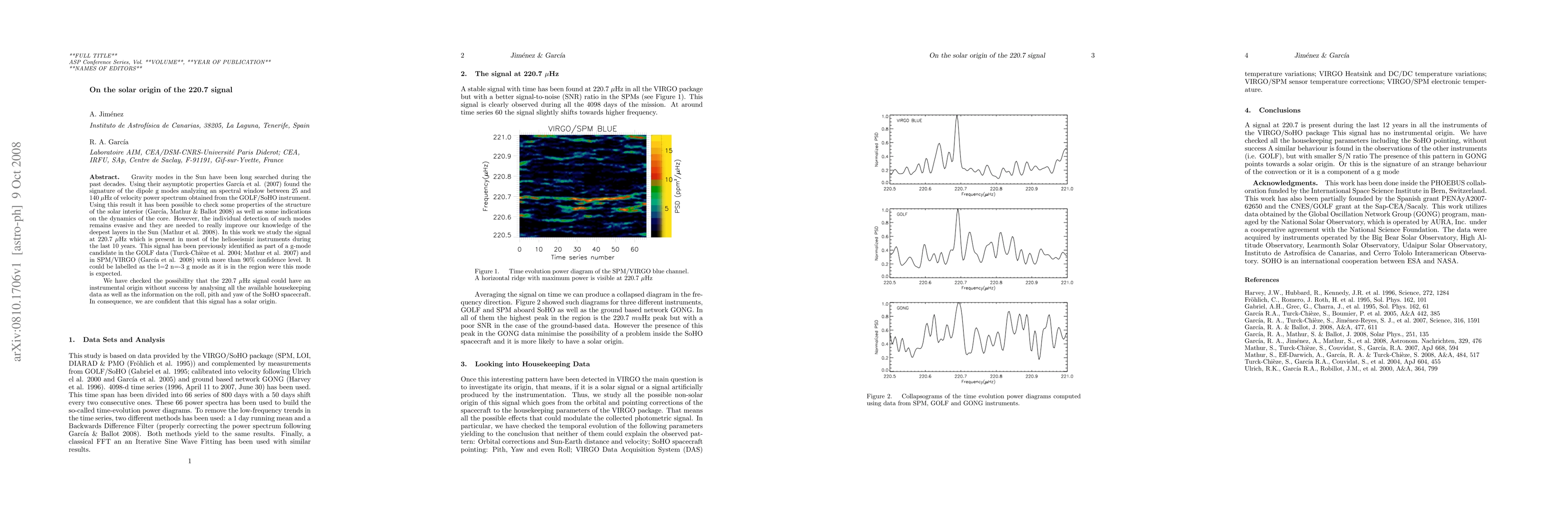 Gravity modes in the Sun have been long searched during the past decades. Using their asymptotic properties Garcia et al. (2007) found the signature of the dipole g modes analyzing an spectral window between 25 and 140 muHz of velocity power spectrum obtained from the GOLF/SoHO instrument. Using this result it has been possible to check some properties of the structure of the solar interior (Garcia, Mathur & Ballot 2008) as well as some indications on the dynamics of the core. However, the individual detection of such modes remains evasive and they are needed to really improve our knowledge of the deepest layers in the Sun (Mathur et al. 2008). In this work we study the signal at 220.7 muHz which is present in most of the helioseismic instruments during the last 10 years. This signal has been previously identified as part of a g-mode candidate in the GOLF data (Turck-Chieze et al. 2004; Mathur et al. 2007) and in SPM/VIRGO (Garcia et al. 2008) with more than 90% confidence level. It could be labelled as the l=2 n=-3 g mode as it is in the region were this mode is expected. We have checked the possibility that the 220.7 muHz signal could have an instrumental origin without success by analysing all the available housekeeping data as well as the information on the roll, pith and yaw of the SoHO spacecraft. In consequence, we are confident that this signal has a solar origin.