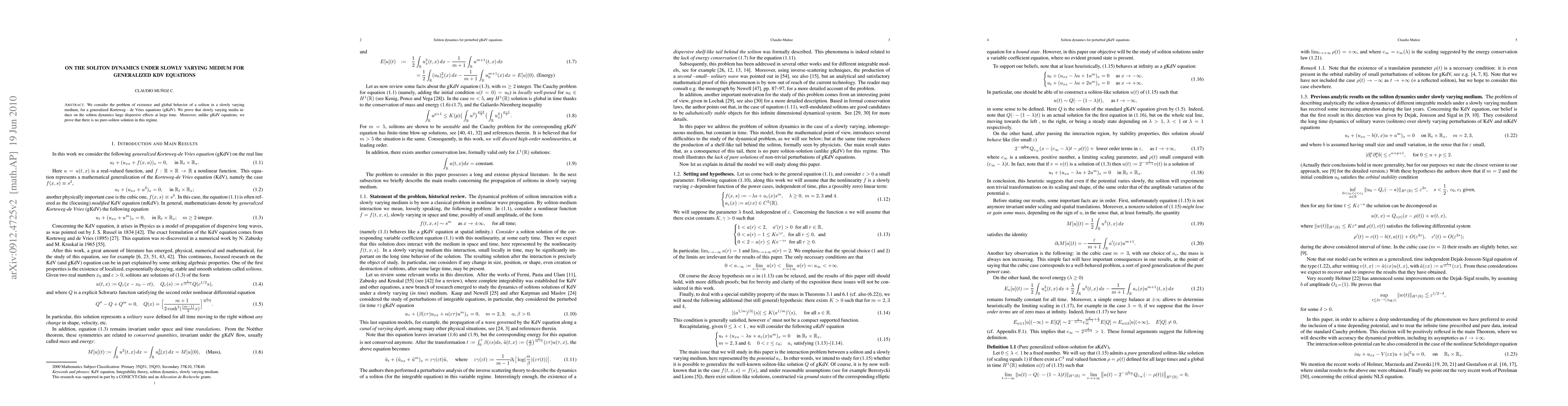 This paper investigates soliton dynamics in generalized KdV equations within a slowly varying medium, demonstrating significant dispersive effects on solitons over time. The study concludes that such media do not support pure-soliton solutions, unlike in homogeneous conditions.