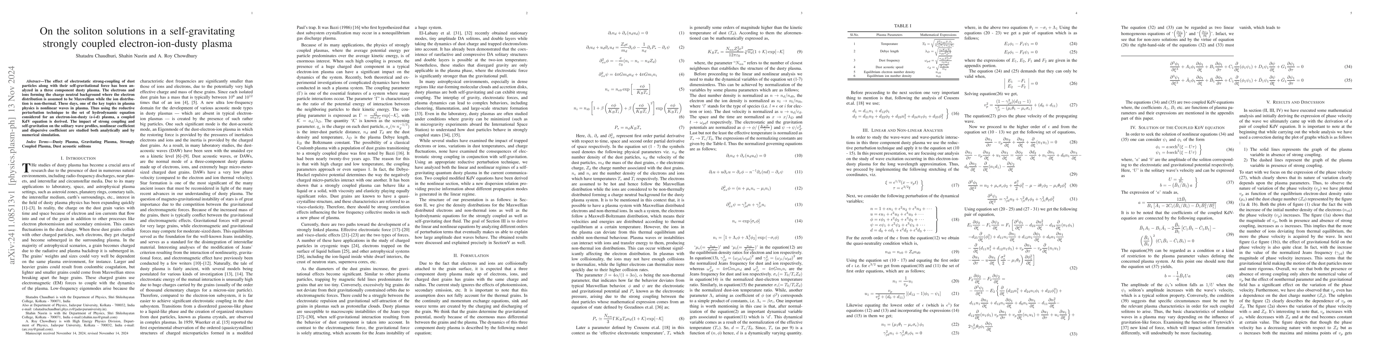 This paper analyzes soliton solutions in a self-gravitating strongly coupled electron-ion-dusty plasma, deriving a coupled KdV equation through reductive perturbation techniques. It examines the effects of electrostatic strong-coupling and self-gravitation on solitary wave profiles, nonlinear, and dispersive coefficients, using both analytical and numerical methods.