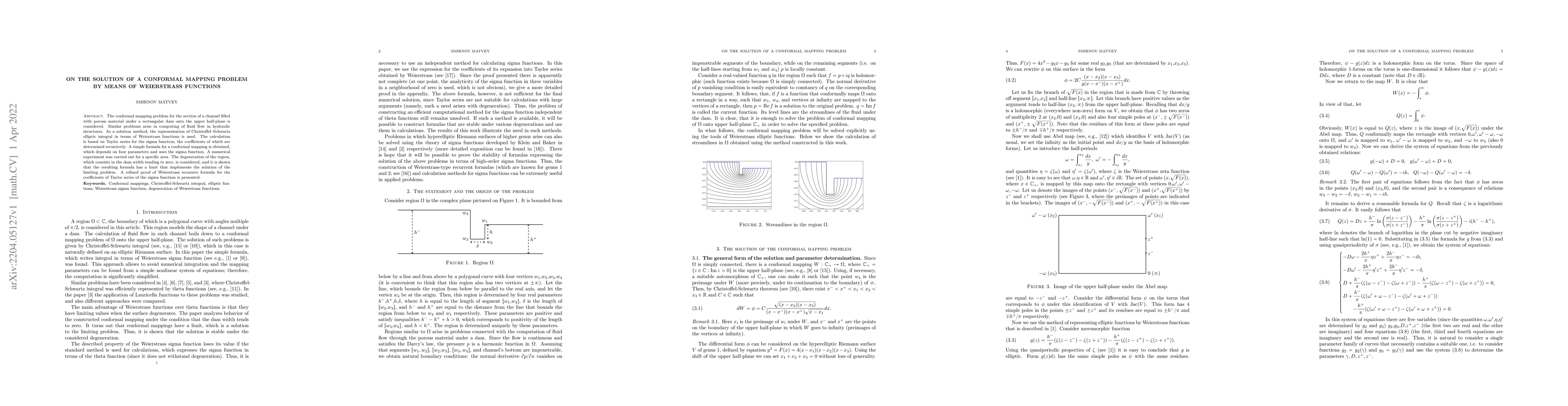 This paper solves a conformal mapping problem for a channel under a rectangular dam using Weierstrass functions, deriving a formula based on Christoffel-Schwartz elliptic integrals and Taylor series. It also examines the degeneration of the region and provides a refined proof for the recursive formula of the sigma function.