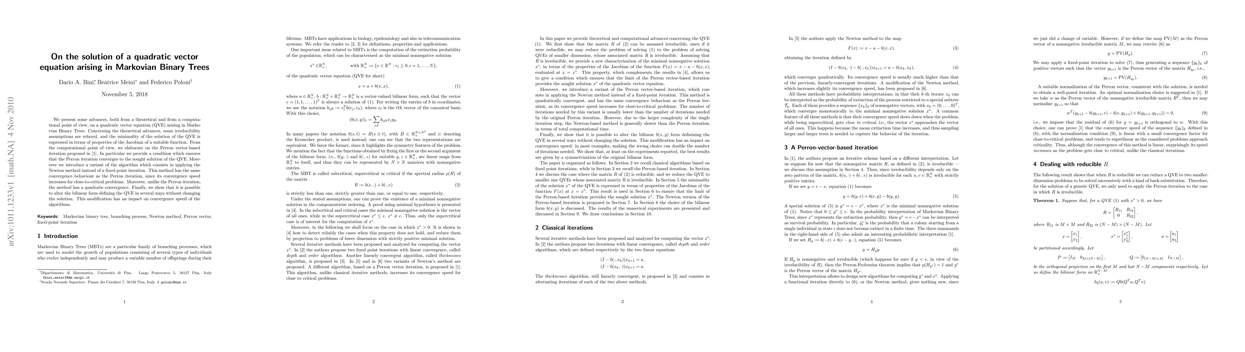We present some advances, both from a theoretical and from a computational point of view, on a quadratic vector equation (QVE) arising in Markovian Binary Trees. Concerning the theoretical advances, some irreducibility assumptions are relaxed, and the minimality of the solution of the QVE is expressed in terms of properties of the Jacobian of a suitable function. From the computational point of view, we elaborate on the Perron vector-based iteration proposed in [http://arxiv.org/abs/1006.0577]. In particular we provide a condition which ensures that the Perron iteration converges to the sought solution of the QVE. Moreover we introduce a variant of the algorithm which consists in applying the Newton method instead of a fixed-point iteration. This method has the same convergence behaviour as the Perron iteration, since its convergence speed increases for close-to-critical problems. Moreover, unlike the Perron iteration, the method has a quadratic convergence. Finally, we show that it is possible to alter the bilinear form defining the QVE in several ways without changing the solution. This modification has an impact on convergence speed of the algorithms.