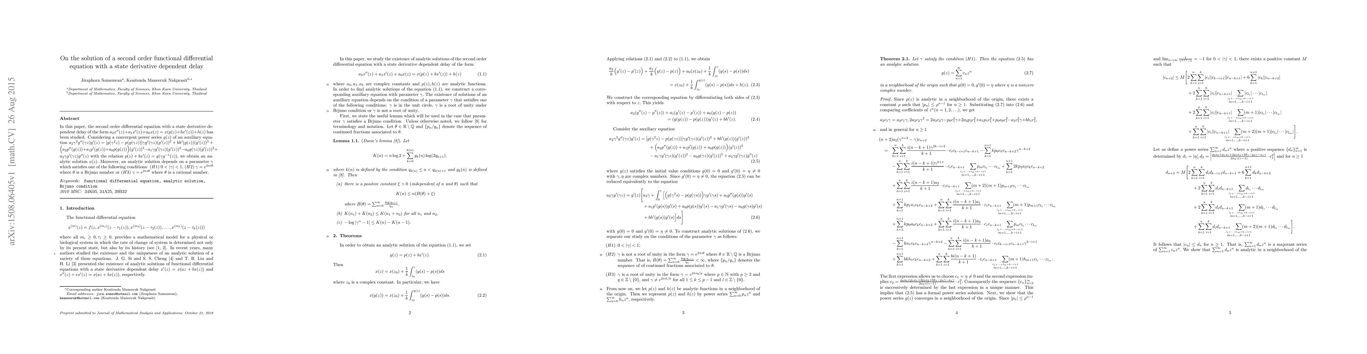 A second-order functional differential equation with a state derivative dependent delay is solved using an auxiliary equation, yielding an analytic solution that depends on parameter η satisfying specific conditions.