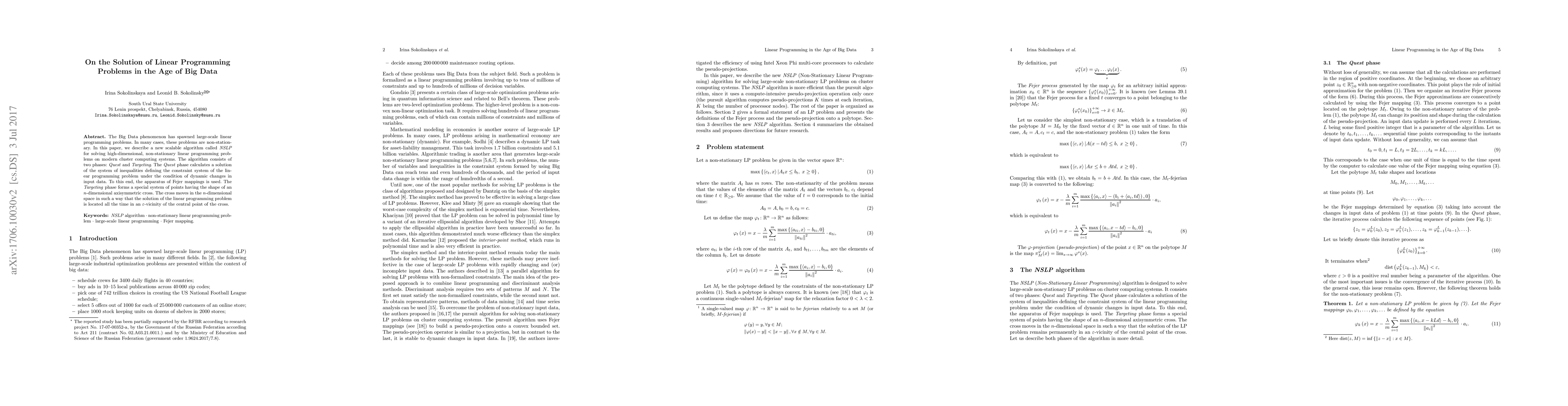 This paper introduces NSLP, a scalable algorithm designed for solving large-scale, non-stationary linear programming problems arising from Big Data. NSLP operates in two phases: Quest, utilizing Fejer mappings to find a solution under dynamic data changes, and Targeting, which maintains the solution within an -vicinity of the cross' center in n-dimensional space.