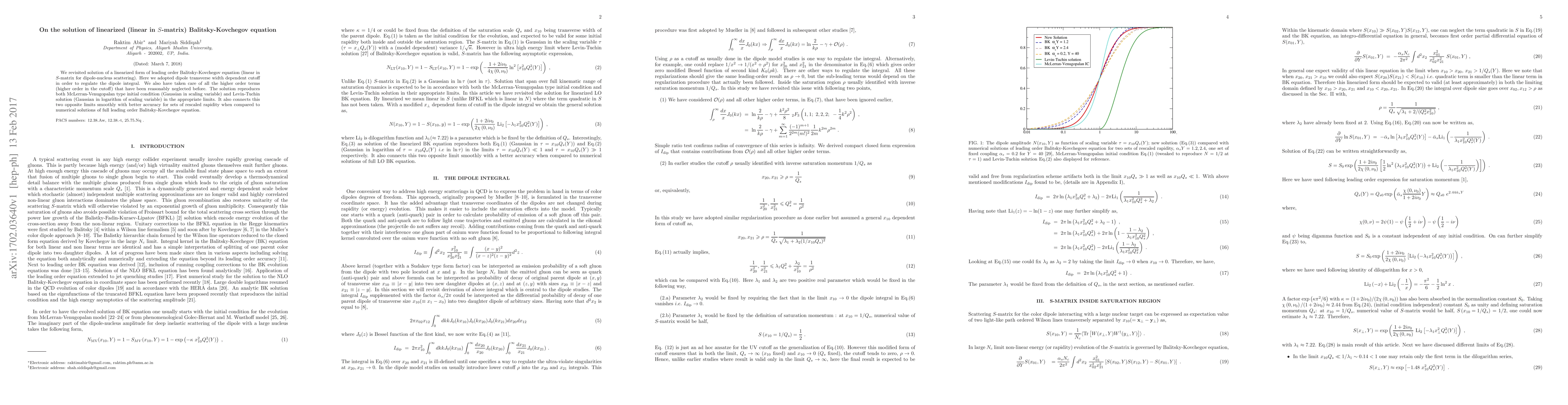This paper revisits the solution of a linearized Balitsky-Kovchegov equation, adopting a dipole transverse width dependent cutoff for regulation. The solution accurately connects McLerran-Venugopalan and Levin-Tuchin initial conditions, offering improved accuracy compared to numerical solutions of the full equation.