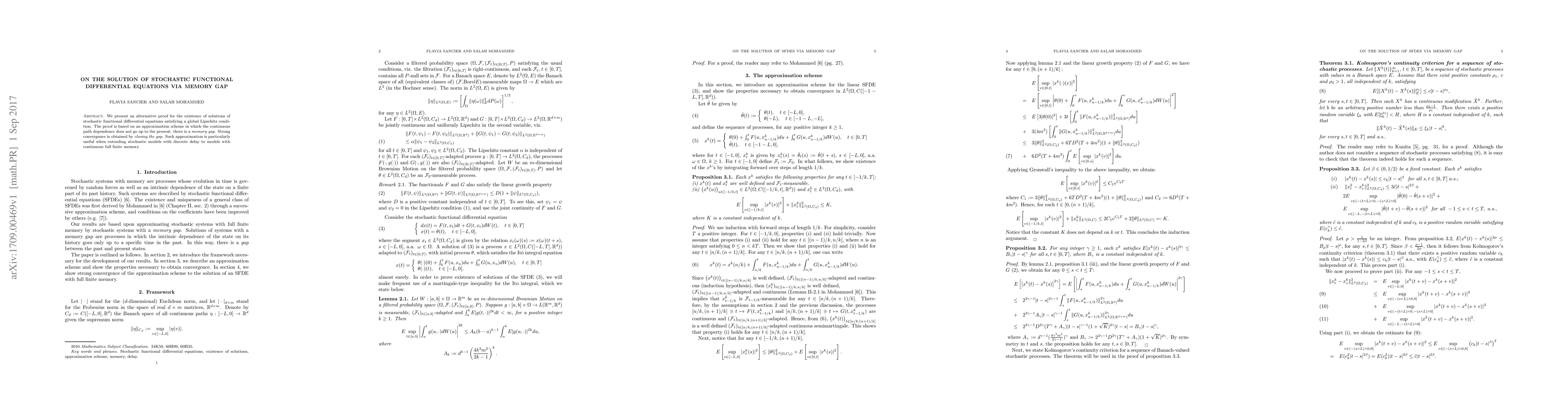 This paper provides an alternative proof for the existence of solutions to stochastic functional differential equations under a global Lipschitz condition, utilizing an approximation scheme that introduces a memory gap. The method ensures strong convergence by closing this gap, which is especially beneficial for extending discrete delay models to continuous full finite memory models.